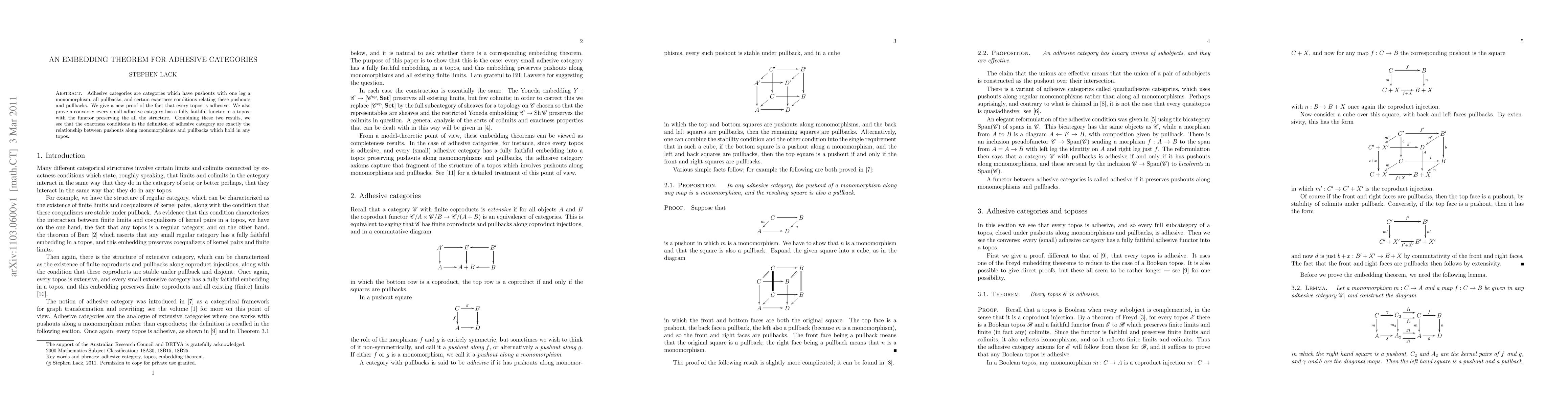 A new proof shows that every topos is an adhesive category, and a converse result establishes that every small adhesive category has a fully faithful functor in a topos.