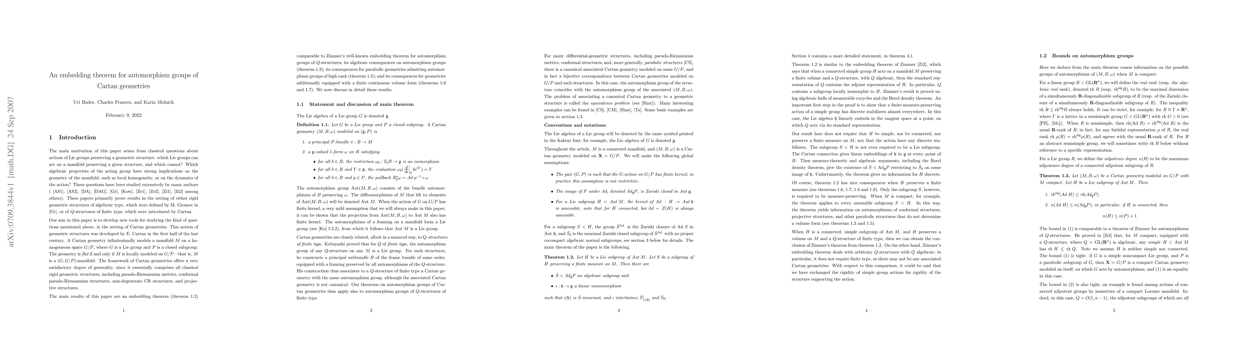 This paper proves an embedding theorem linking the automorphism group of a Cartan geometry to the group it models, showing a component of the adjoint representation of the former embeds in the latter. The theorem provides bounds on the automorphism group's rank and nilpotence degree, asserts local homogeneity and completeness for certain parabolic geometries, and establishes a local freeness theorem for actions preserving a continuous volume form.