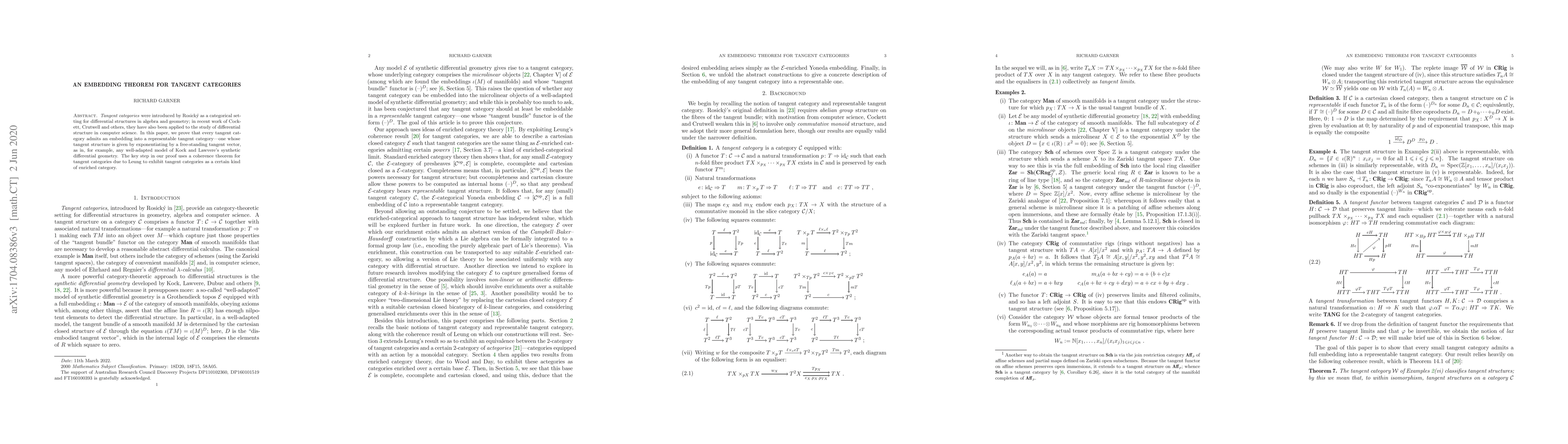 This paper proves that any tangent category, a framework for differential structures, can be embedded into a representable tangent category. The proof leverages a coherence theorem to show tangent categories can be viewed as a specific type of enriched category.