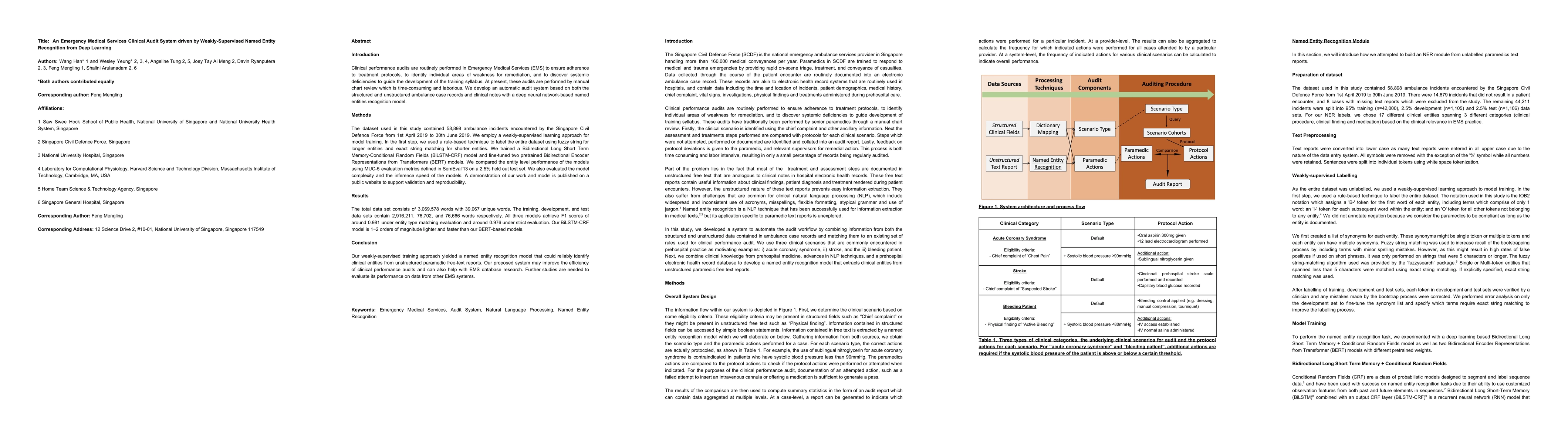 Clinical performance audits are routinely performed in Emergency Medical Services (EMS) to ensure adherence to treatment protocols, to identify individual areas of weakness for remediation, and to discover systemic deficiencies to guide the development of the training syllabus. At present, these audits are performed by manual chart review which is time-consuming and laborious. In this paper, we present an automatic audit system based on both the structured and unstructured ambulance case records and clinical notes with a deep neural network-based named entities recognition model. The dataset used in this study contained 58,898 unlabelled ambulance incidents encountered by the Singapore Civil Defence Force from 1st April 2019 to 30th June 2019. A weakly-supervised training approach was adopted to label the sentences. Later on, we trained three different models to perform the NER task. All three models achieve F1 scores of around 0.981 under entity type matching evaluation and around 0.976 under strict evaluation, while the BiLSTM-CRF model is 1~2 orders of magnitude lighter and faster than our BERT-based models. Overall, our approach yielded a named entity recognition model that could reliably identify clinical entities from unstructured paramedic free-text reports. Our proposed system may improve the efficiency of clinical performance audits and can also help with EMS database research.