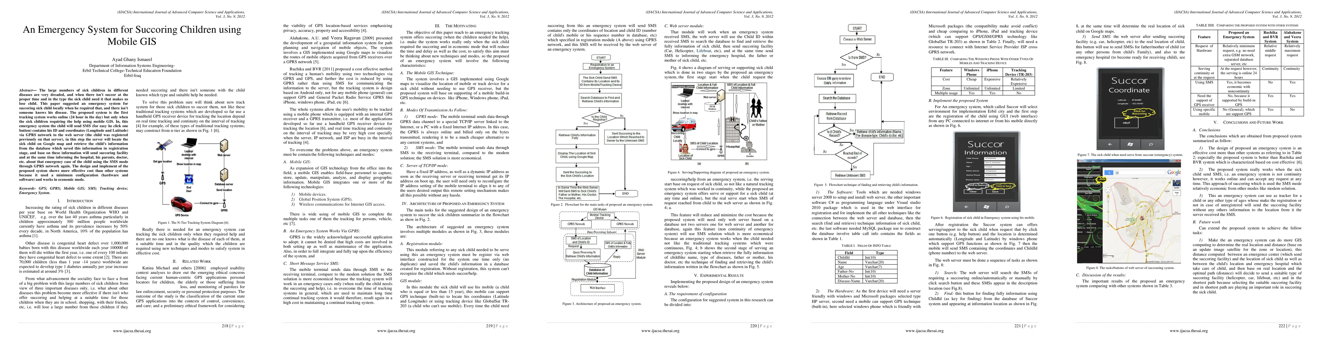 The large numbers of sick children in different diseases are very dreaded, and when there isn't succor at the proper time and in the type the sick child need it that makes us lose child. This paper suggested an emergency system for succoring sick child locally when he required that, and there isn't someone knows his disease. The proposed system is the first tracking system works online (24 hour in the day) but only when the sick children requiring the help using mobile GIS. In, this emergency system the child will send SMS (for easy he click one button) contains his ID and coordinates (Longitude and Latitude) via GPRS network to the web server (the child was registered previously on that server), in this step the server will locate the sick child on Google map and retrieve the child's information from the database which saved this information in registration stage, and base on these information will send succoring facility and at the same time informing the hospital, his parents, doctor, etc. about that emergency case of the child using the SMS mode through GPRS network again. The design and implement of the proposed system shows more effective cost than other systems because it used a minimum configuration (hardware and software) and works in economic mode. Keywords- GPS; GPRS; Mobile GIS; SMS; Tracking device; Emergency System.