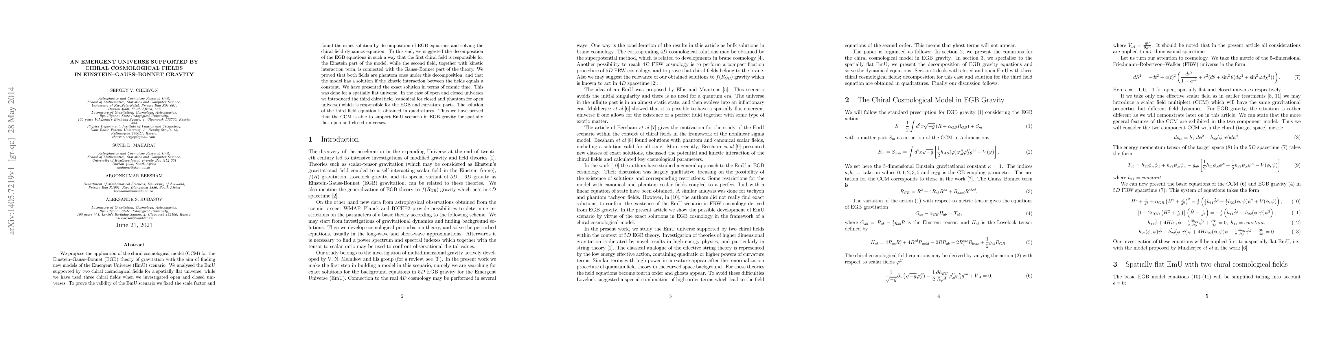 This paper proposes a chiral cosmological model (CCM) within Einstein-Gauss-Bonnet (EGB) gravity to explore an Emergent Universe (EmU) scenario. The authors demonstrate that two chiral fields support a spatially flat EmU, while three chiral fields accommodate open and closed universes, proving the model's validity through exact solutions in terms of cosmic time.
