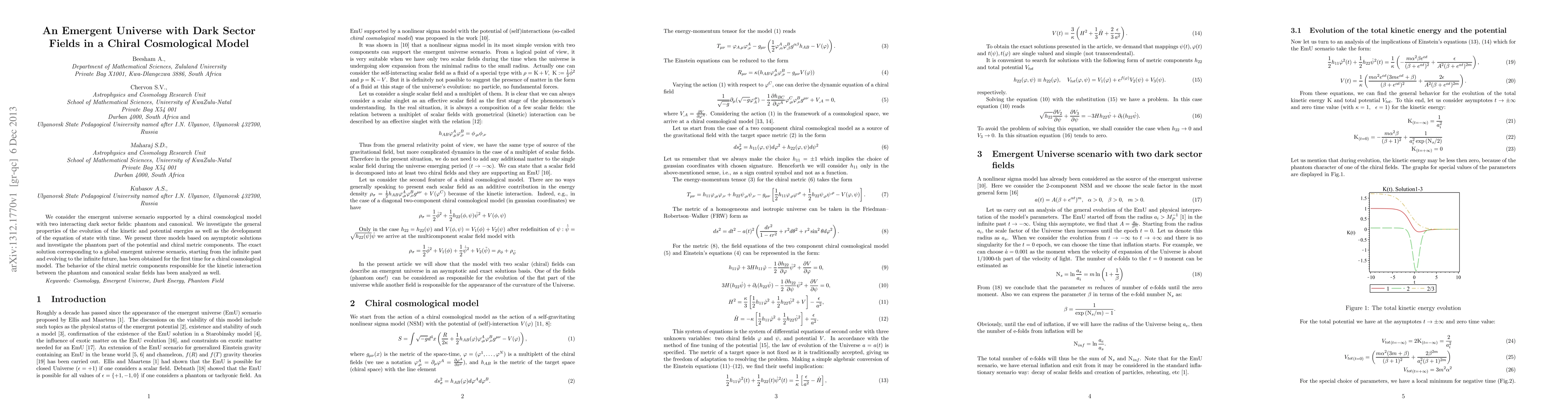 This paper explores an emergent universe model underpinned by a chiral cosmological framework with two interacting dark sector fields—phantom and canonical. It investigates the evolution of kinetic and potential energies and the equation of state, presenting three models based on asymptotic solutions and analyzing the phantom potential and chiral metric components, achieving the first exact solution for a global emergent universe scenario.