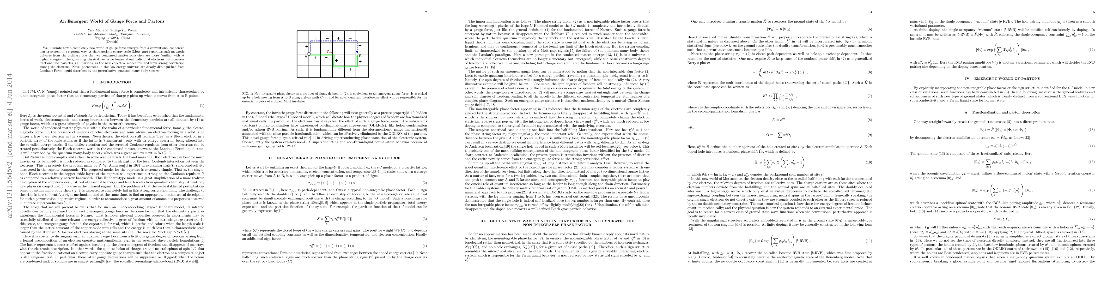 We illustrate how a completely new world of gauge force emerges from a conventional condensed matter system in a rigorous way. A characteristic energy scale (Mott gap) separates such an exotic universe from the ordinary one that we condensed matter physicists are more familiar with at higher energies. The governing physical law is no longer about individual electrons but concerns fractionalized particles, i.e., partons, as the new collective modes resulted from strong correlation among the electrons. Novel phenomena in this low-energy universe are clearly distinguished from Landau's Fermi liquid described by the perturbative quantum many-body theory.
