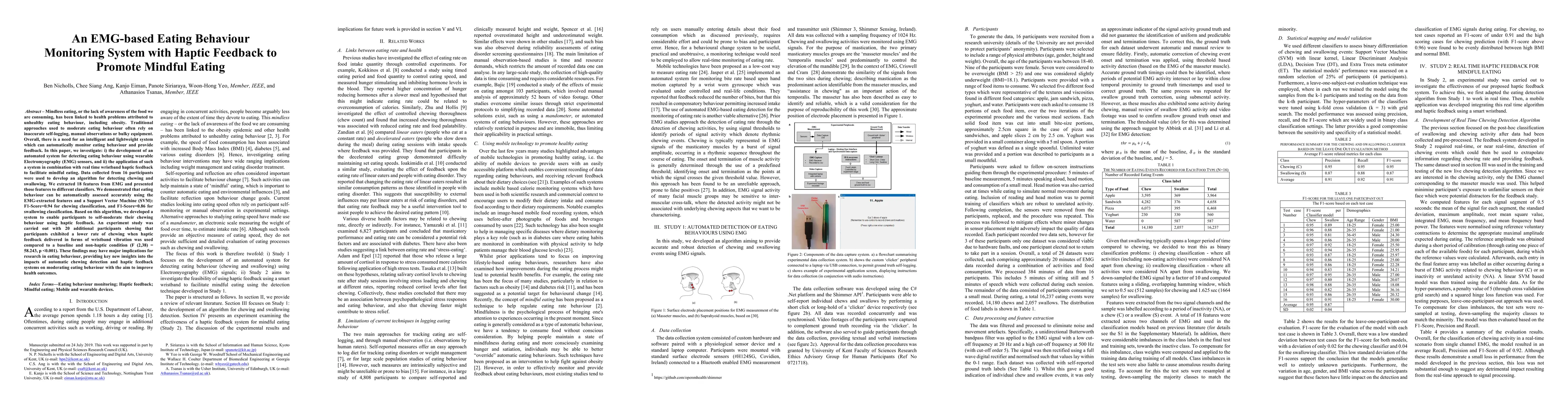 Mindless eating, or the lack of awareness of the food we are consuming, has been linked to health problems attributed to unhealthy eating behaviour, including obesity. Traditional approaches used to moderate eating behaviour often rely on inaccurate self-logging, manual observations or bulky equipment. Overall, there is a need for an intelligent and lightweight system which can automatically monitor eating behaviour and provide feedback. In this paper, we investigate: i) the development of an automated system for detecting eating behaviour using wearable Electromyography (EMG) sensors, and ii) the application of such a system in combination with real time wristband haptic feedback to facilitate mindful eating. Data collected from 16 participants were used to develop an algorithm for detecting chewing and swallowing. We extracted 18 features from EMG and presented those features to different classifiers. We demonstrated that eating behaviour can be automatically assessed accurately using the EMG-extracted features and a Support Vector Machine (SVM): F1-Score=0.94 for chewing classification, and F1-Score=0.86 for swallowing classification. Based on this algorithm, we developed a system to enable participants to self-moderate their chewing behaviour using haptic feedback. An experiment study was carried out with 20 additional participants showing that participants exhibited a lower rate of chewing when haptic feedback delivered in forms of wristband vibration was used compared to a baseline and non-haptic condition (F (2,38)=58.243, p<0.001). These findings may have major implications for research in eating behaviour, providing key new insights into the impacts of automatic chewing detection and haptic feedback systems on moderating eating behaviour with the aim to improve health outcomes.
