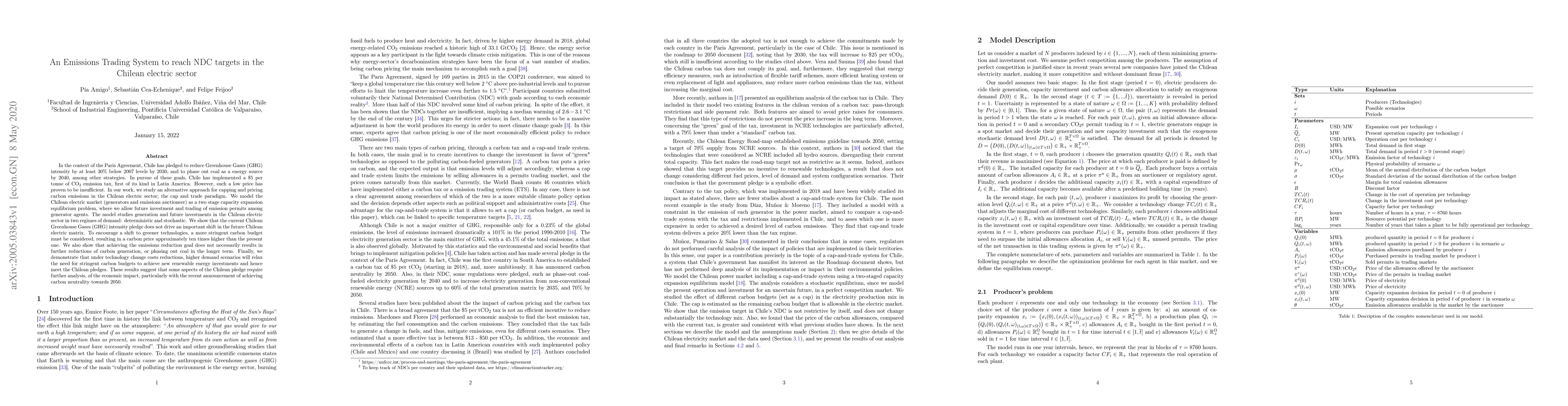 In the context of the Paris Agreement, Chile has pledged to reduce Greenhouse Gases (GHG) intensity by at least 30% below 2007 levels by 2030, and to phase out coal as a energy source by 2040, among other strategies. In pursue of these goals, Chile has implemented a $5 per tonne of CO2 emission tax, first of its kind in Latin America. However, such a low price has proven to be insufficient. In our work, we study an alternative approach for capping and pricing carbon emissions in the Chilean electric sector; the cap and trade paradigm. We model the Chilean electric market (generators and emissions auctioneer) as a two stage capacity expansion equilibrium problem, where we allow future investment and trading of emission permits among generator agents. The model studies generation and future investments in the Chilean electric sector in two regimes of demand: deterministic and stochastic. We show that the current Chilean Greenhouse Gases (GHG) intensity pledge does not drive an important shift in the future Chilean electric matrix. To encourage a shift to greener technologies, a more stringent carbon budget must be considered, resulting in a carbon price approximately ten times higher than the present one. We also show that achieving the emissions reduction goal does not necessarily results in further reductions of carbon generation, or phasing out coal in the longer term. Finally, we demonstrate that under technology change costs reductions, higher demand scenarios will relax the need for stringent carbon budgets to achieve new renewable energy investments and hence meet the Chilean pledges. These results suggest that some aspects of the Chilean pledge require further analysis, of the economic impact, particularly with the recent announcement of achieving carbon neutrality towards 2050.