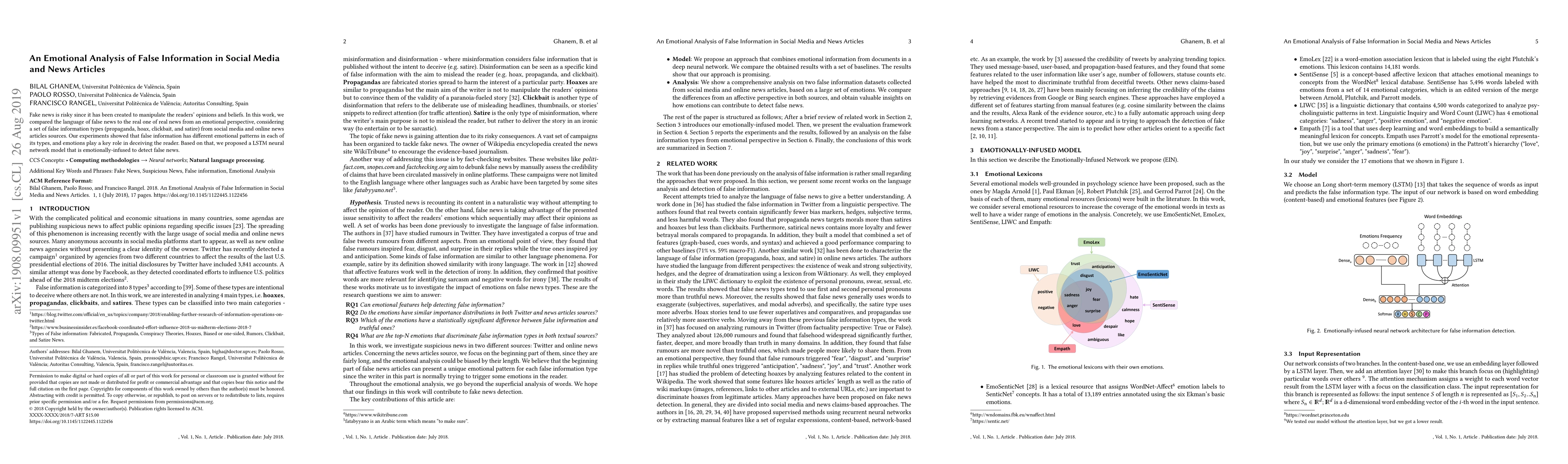 This study examines the emotional patterns in different types of false news compared to real news, revealing distinct emotional profiles for propaganda, hoax, clickbait, and satire. The research proposes an emotionally-infused LSTM neural network model to detect false news, highlighting the role of emotions in deceiving readers.
