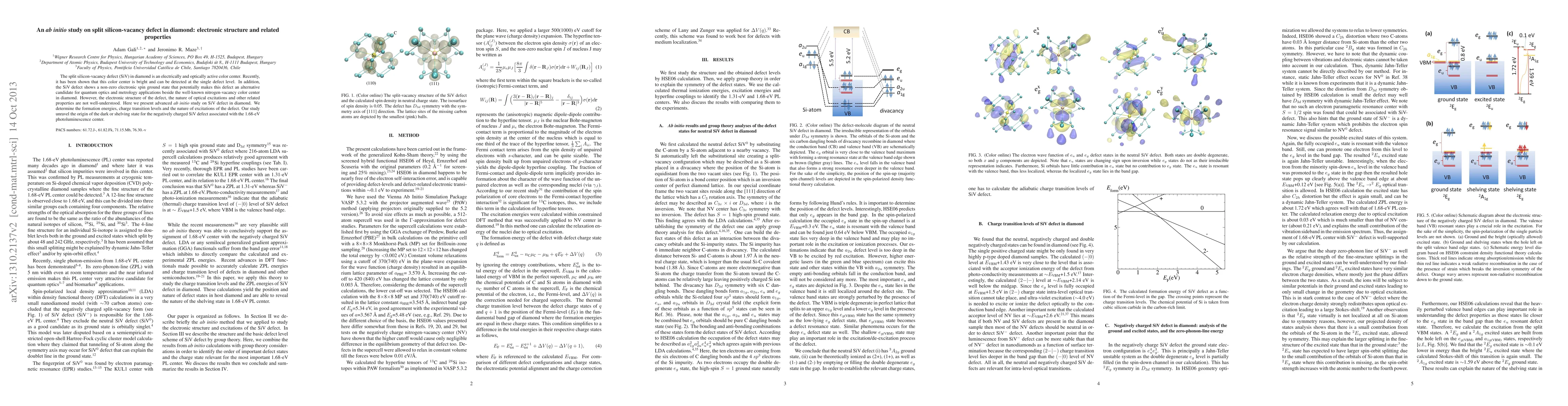 The split silicon-vacancy defect (SiV) in diamond is an electrically and optically active color center. Recently, it has been shown that this color center is bright and can be detected at the single defect level. In addition, the SiV defect shows a non-zero electronic spin ground state that potentially makes this defect an alternative candidate for quantum optics and metrology applications beside the well-known nitrogen-vacancy color center in diamond. However, the electronic structure of the defect, the nature of optical excitations and other related properties are not well-understood. Here we present advanced \emph{ab initio} study on SiV defect in diamond. We determine the formation energies, charge transition levels and the nature of excitations of the defect. Our study unravel the origin of the dark or shelving state for the negatively charged SiV defect associated with the 1.68-eV photoluminescence center.