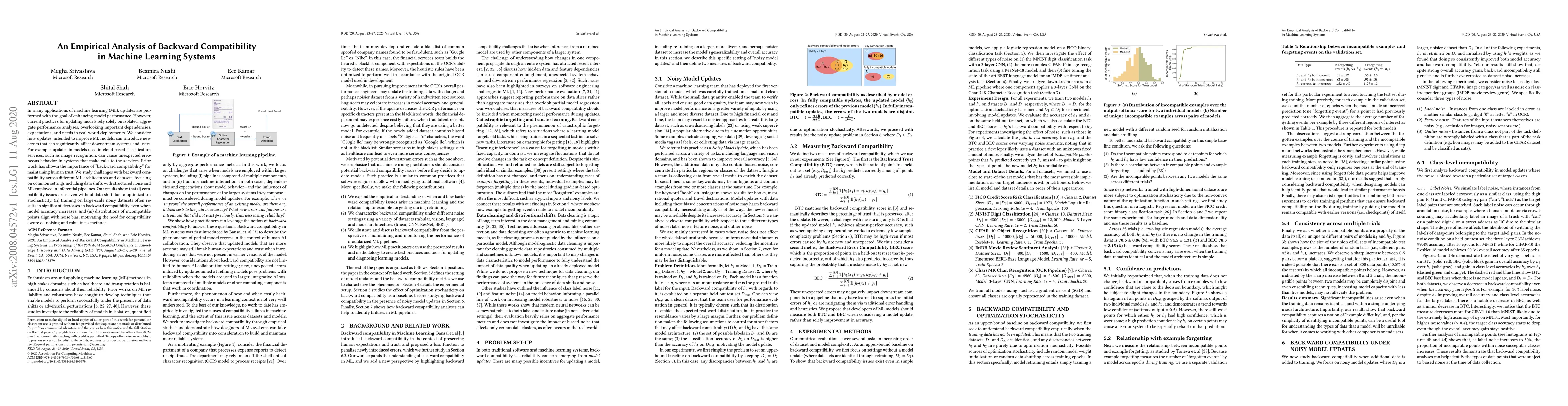 This paper investigates the challenges of backward compatibility in machine learning model updates, revealing that even without data shifts, optimization stochasticity can introduce errors affecting downstream systems. It finds that training on noisy datasets often decreases backward compatibility despite improved accuracy, highlighting the need for robustness and de-noising methods.
