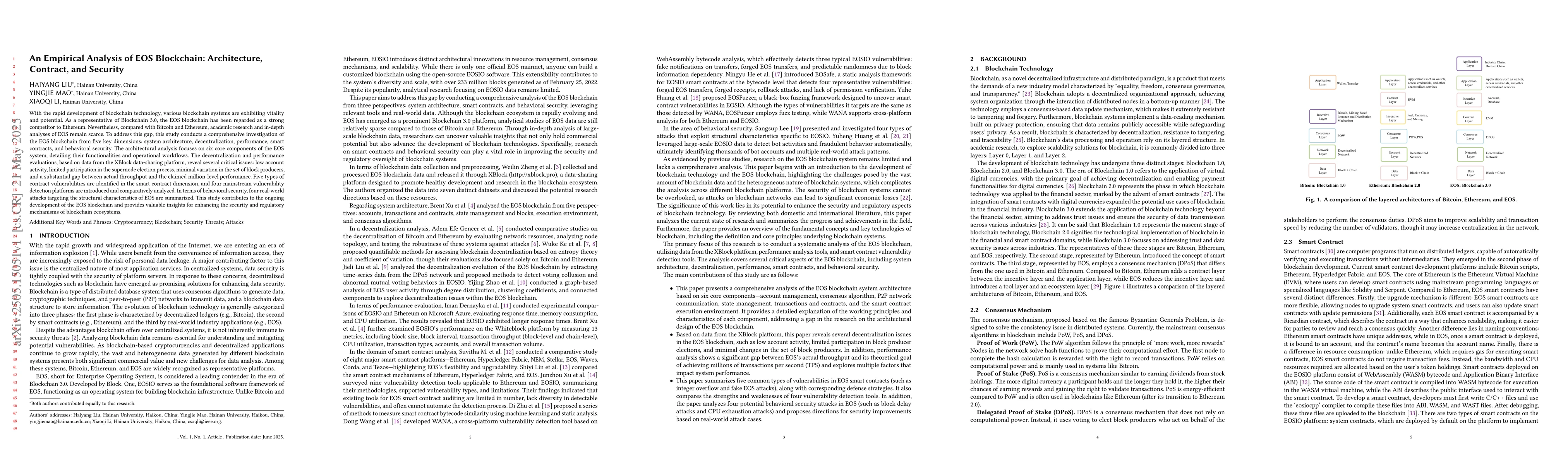 This study is among the first to conduct an in-depth analysis of EOS blockchain, focusing on aspects like architecture, decentralization, performance, smart contracts, and behavioral security, which are relatively under-researched compared to Bitcoin and Ethereum.
