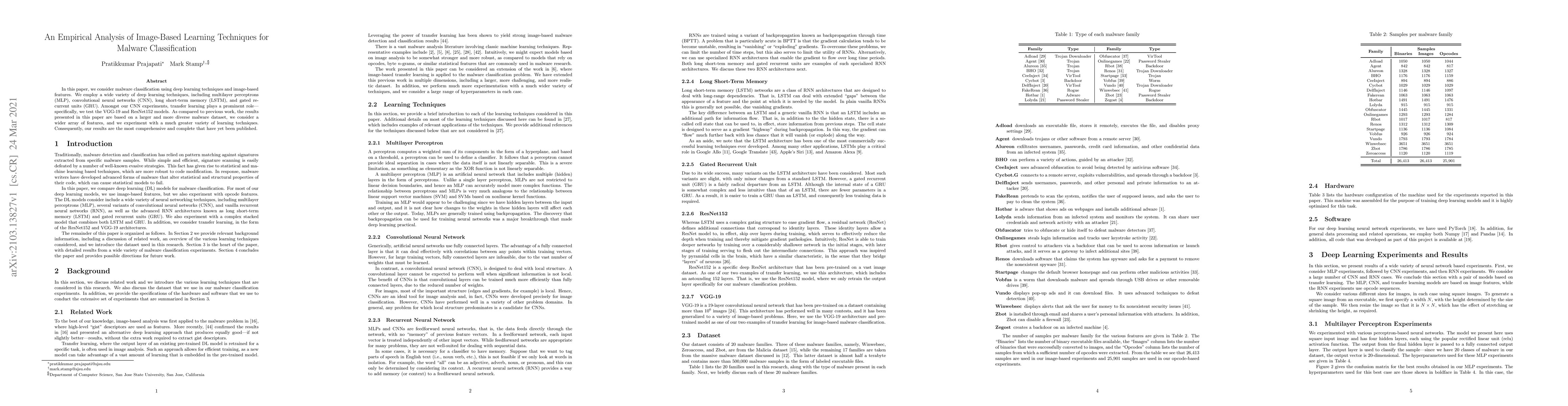 This paper explores malware classification using various deep learning techniques, including MLP, CNN, LSTM, and GRU, with a focus on image-based features and transfer learning models like VGG-19 and ResNet152. The study presents the most comprehensive results to date based on a larger, more diverse dataset and a wider array of features.
