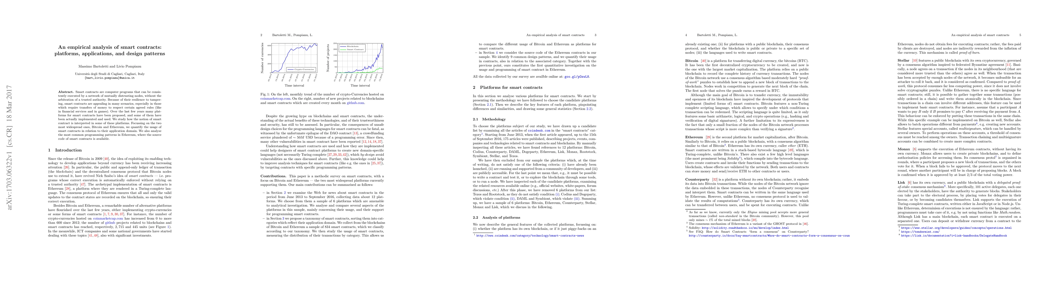Smart contracts are computer programs that can be consistently executed by a network of mutually distrusting nodes, without the arbitration of a trusted authority. Because of their resilience to tampering, smart contracts are appealing in many scenarios, especially in those which require transfers of money to respect certain agreed rules (like in financial services and in games). Over the last few years many platforms for smart contracts have been proposed, and some of them have been actually implemented and used. We study how the notion of smart contract is interpreted in some of these platforms. Focussing on the two most widespread ones, Bitcoin and Ethereum, we quantify the usage of smart contracts in relation to their application domain. We also analyse the most common programming patterns in Ethereum, where the source code of smart contracts is available.