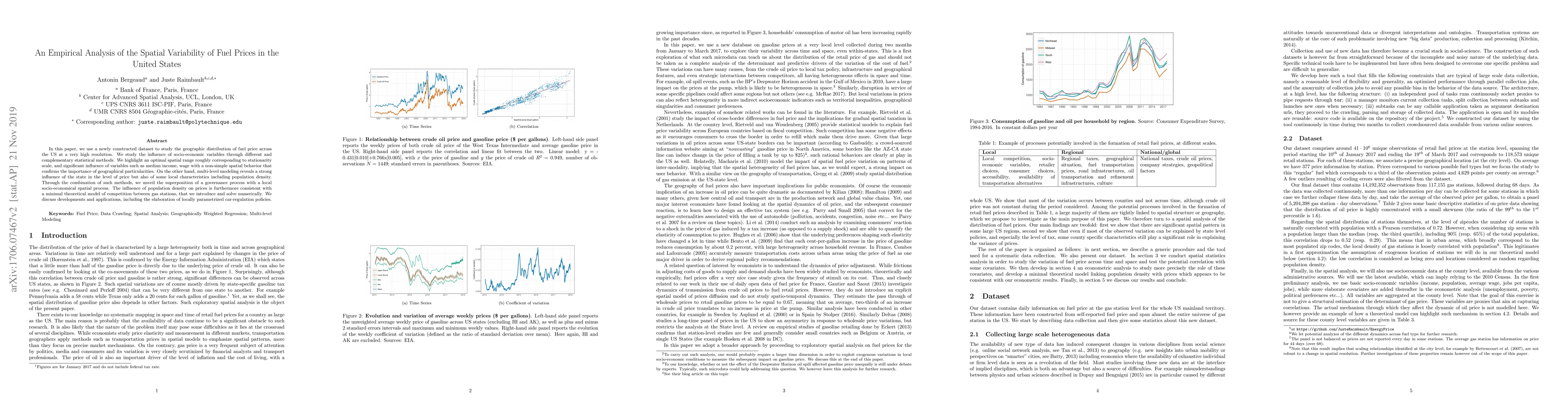 In this paper, we use a newly constructed dataset to study the geographic distribution of fuel price across the US at a very high resolution. We study the influence of socio-economic variables through different and complementary statistical methods. We highlight an optimal spatial range roughly corresponding to stationarity scale, and significant influence of variables such as median income, wage with a non-simple spatial behavior that confirms the importance of geographical particularities. On the other hand, multi-level modeling reveals a strong influence of the state in the level of price but also of some local characteristics including population density. Through the combination of such methods, we unveil the superposition of a governance process with a local socio-economical spatial process. The influence of population density on prices is furthermore consistent with a minimal theoretical model of competition between gas stations, that we introduce and solve numerically. We discuss developments and applications, including the elaboration of locally parametrized car-regulation policies.