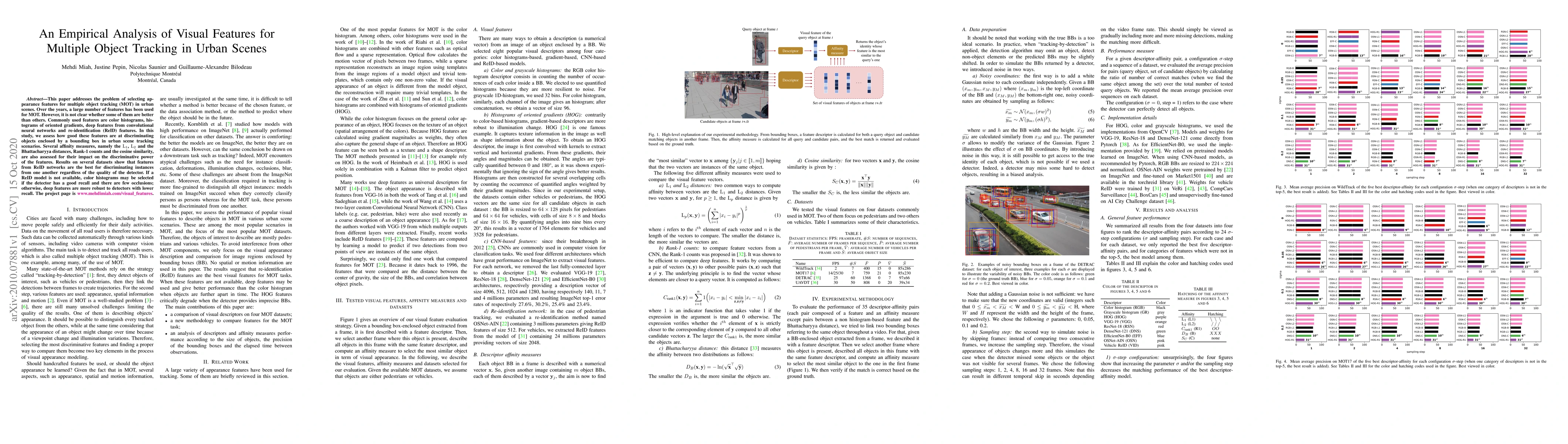 This paper evaluates various visual features for multiple object tracking in urban scenes, finding that ReID features are most effective for discrimination. When ReID features are unavailable, color histograms work best with high-recall detectors and low occlusion, while deep features are more robust to lower recall detectors.