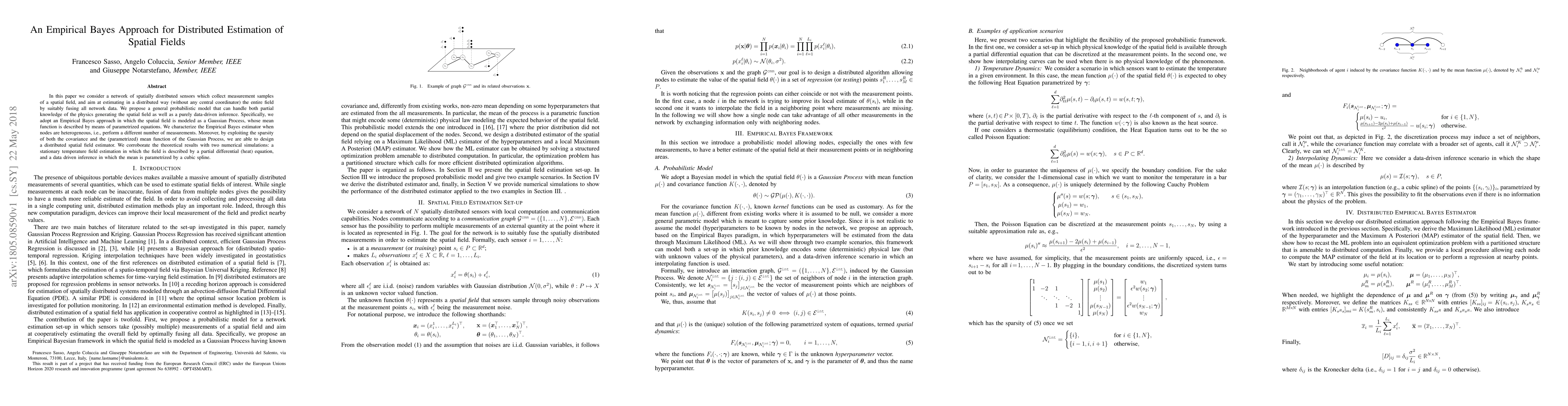 This paper proposes an Empirical Bayes approach for distributed estimation of spatial fields using Gaussian Processes, enabling nodes to estimate a field without a central coordinator, with applications in various fields.