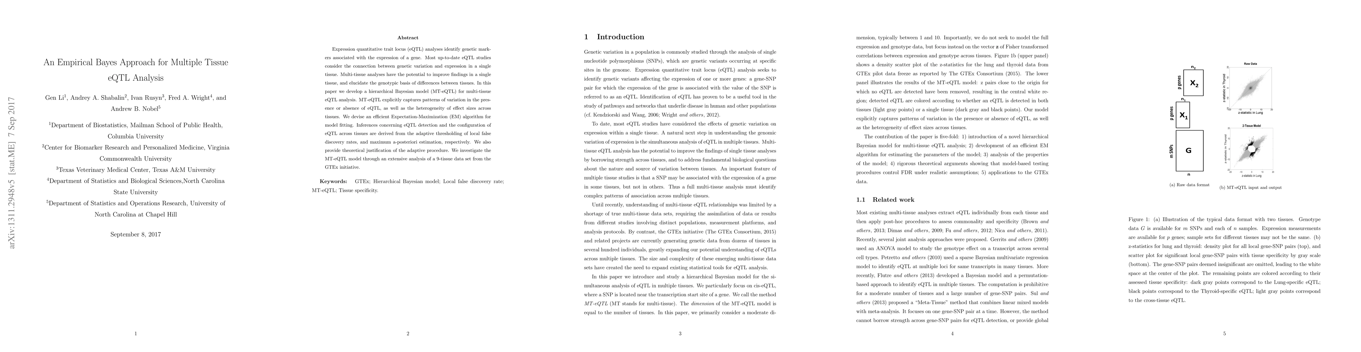 This paper introduces a multivariate hierarchical Bayesian model, MT-eQTL, for analyzing multi-tissue expression quantitative trait loci (eQTL) data. The model captures correlations between genotype and expression across tissues, and is applicable to complex, overlapping donor sets.