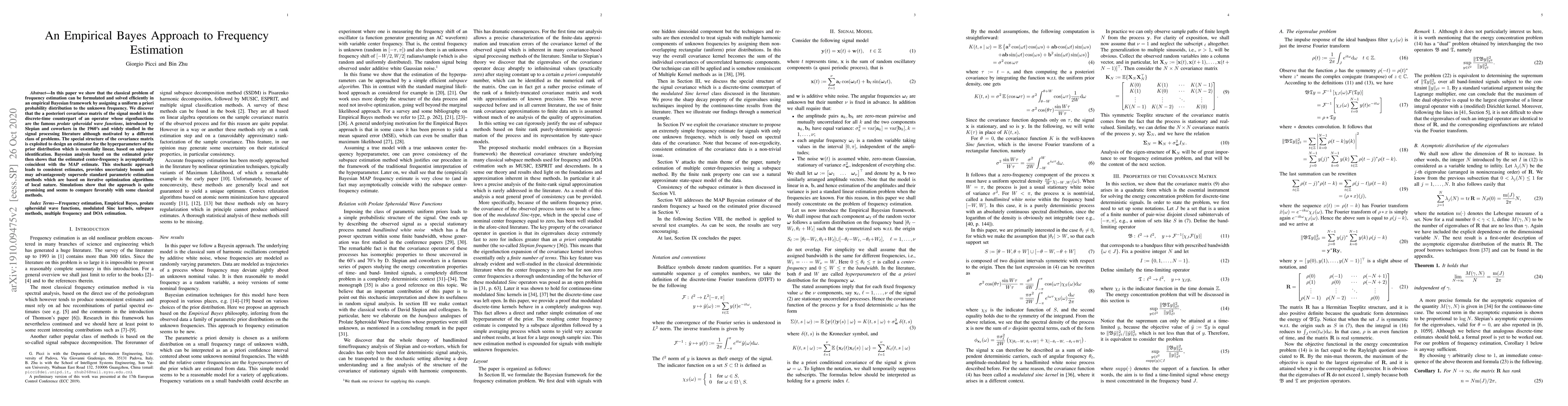 Researchers developed an Empirical Bayes approach to estimate frequencies in signals, leveraging a priori probability distribution and exploiting the structure of the covariance matrix for efficient estimation. The method provides consistent estimates, uncertainty bounds, and may surpass classical parametric methods through its stochastic nature.