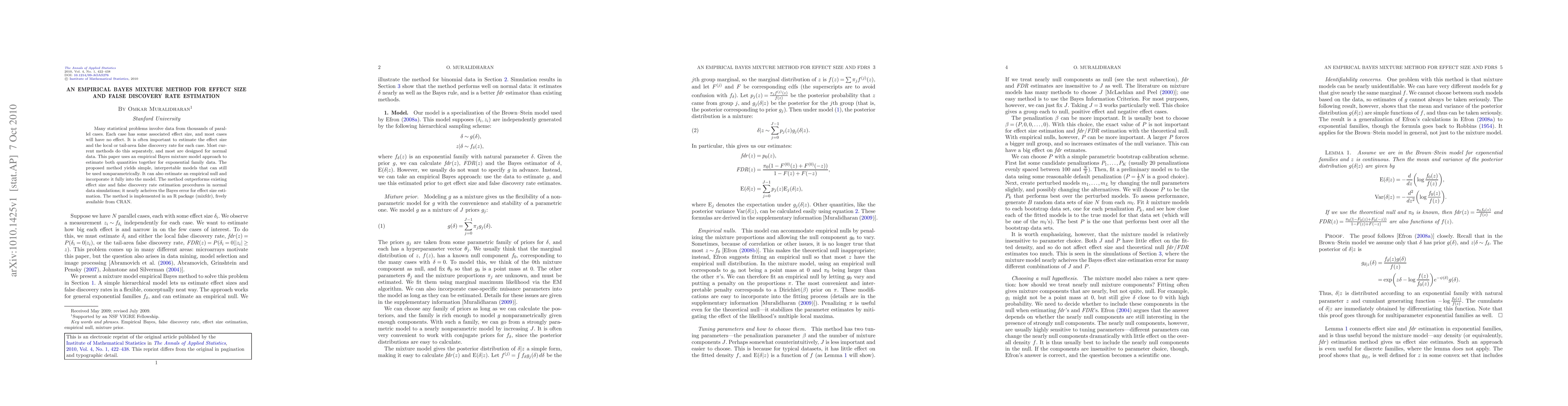 This paper proposes an empirical Bayes mixture method to jointly estimate effect sizes and false discovery rates for exponential family data, outperforming existing methods in simulations. The approach provides simple, interpretable models and is implemented in an R package called mixfdr.