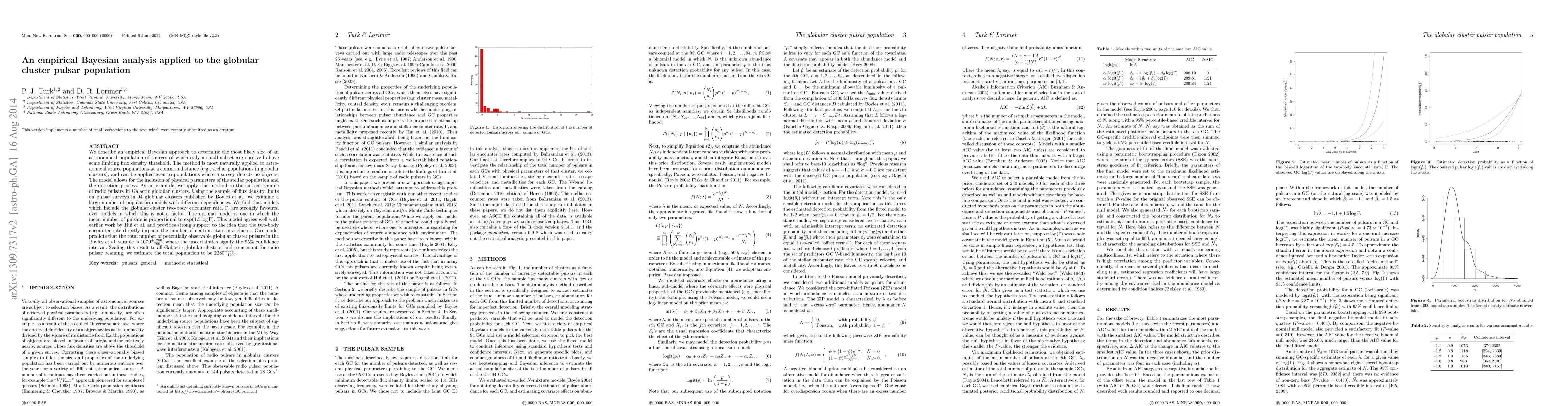 We describe an empirical Bayesian approach to determine the most likely size of an astronomical population of sources of which only a small subset are observed above some limiting flux density threshold. The method is most naturally applied to astronomical source populations at a common distance (e.g.,stellar populations in globular clusters), and can be applied even to populations where a survey detects no objects. The model allows for the inclusion of physical parameters of the stellar population and the detection process. As an example, we apply this method to the current sample of radio pulsars in Galactic globular clusters. Using the sample of flux density limits on pulsar surveys in 94 globular clusters published by Boyles et al., we examine a large number of population models with different dependencies. We find that models which include the globular cluster two-body encounter rate, $\Gamma$, are strongly favoured over models in which this is not a factor. The optimal model is one in which the mean number of pulsars is proportional to $\exp(1.5 \log \Gamma)$. This model agrees well with earlier work by Hui et al. and provides strong support to the idea that the two-body encounter rate directly impacts the number of neutron stars in a cluster. Our model predicts that the total number of potentially observable globular cluster pulsars in the Boyles et al. sample is 1070$^{+1280}_{-700}$, where the uncertainties signify the 95% confidence interval. Scaling this result to all Galactic globular clusters, and to account for radio pulsar beaming, we estimate the total population to be 2280$^{+2720}_{-1490}$.