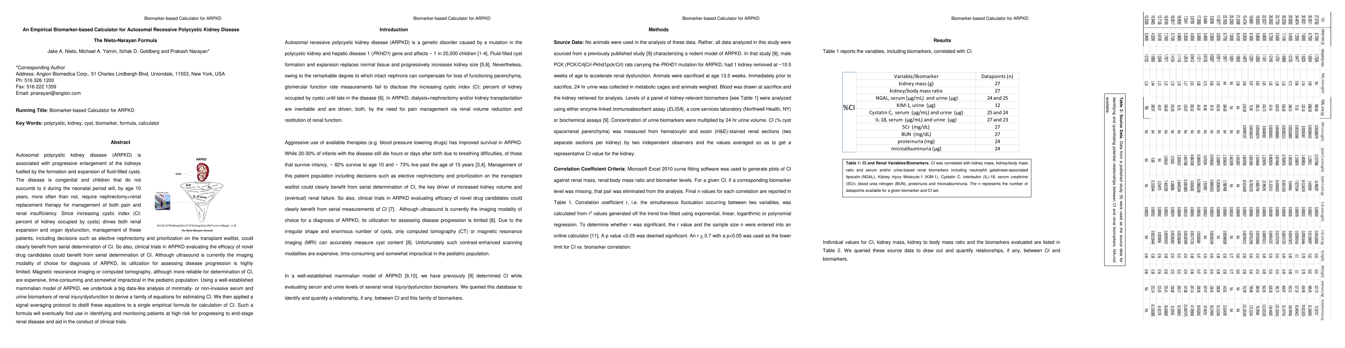 The Nieto-Narayan Formula provides an empirical biomarker-based calculator to estimate the cystic index (CI) in autosomal recessive polycystic kidney disease (ARPKD), offering a minimally invasive alternative to costly imaging methods for monitoring disease progression and aiding clinical trial evaluations. This formula derives from a comprehensive analysis of serum and urine biomarkers in a mammalian ARPKD model.