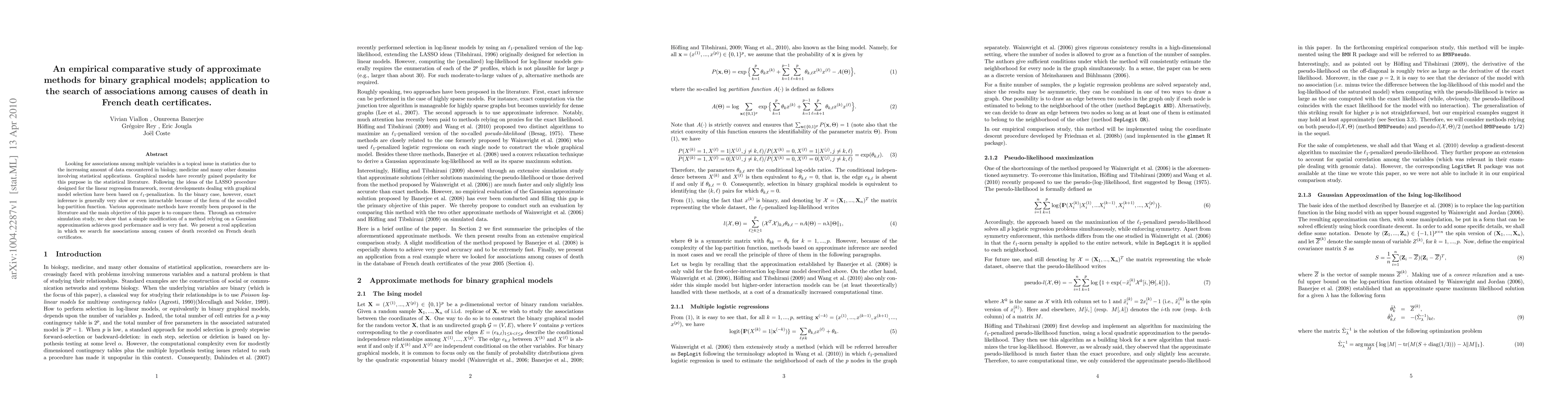 This paper compares various approximate methods for binary graphical models, focusing on their performance and computational efficiency. A modified Gaussian approximation method is found to be both effective and fast, demonstrated through simulations and a real-world application analyzing associations among causes of death in French death certificates.