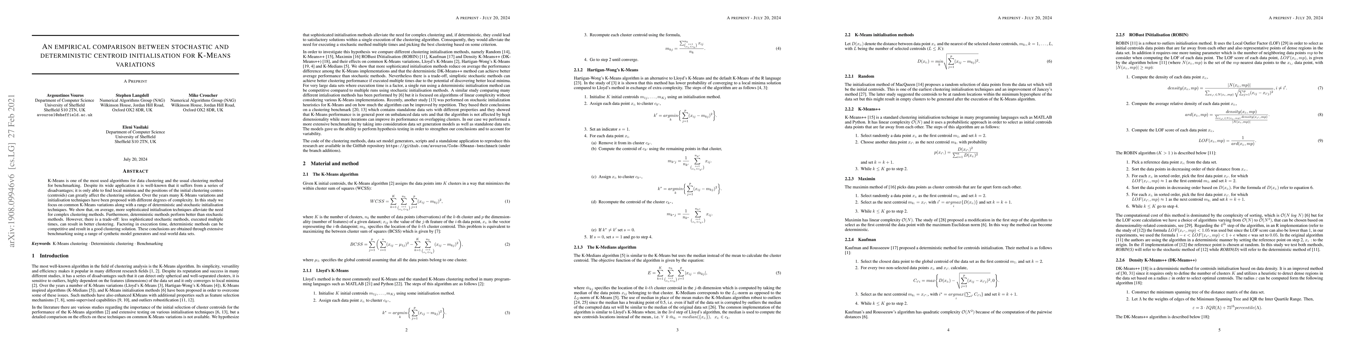 This study compares deterministic and stochastic centroid initialization techniques for various K-Means clustering variations, finding that deterministic methods generally perform better, though stochastic methods executed multiple times can yield superior results. The research concludes that sophisticated initialization can reduce the need for complex clustering methods, balancing performance and execution time.
