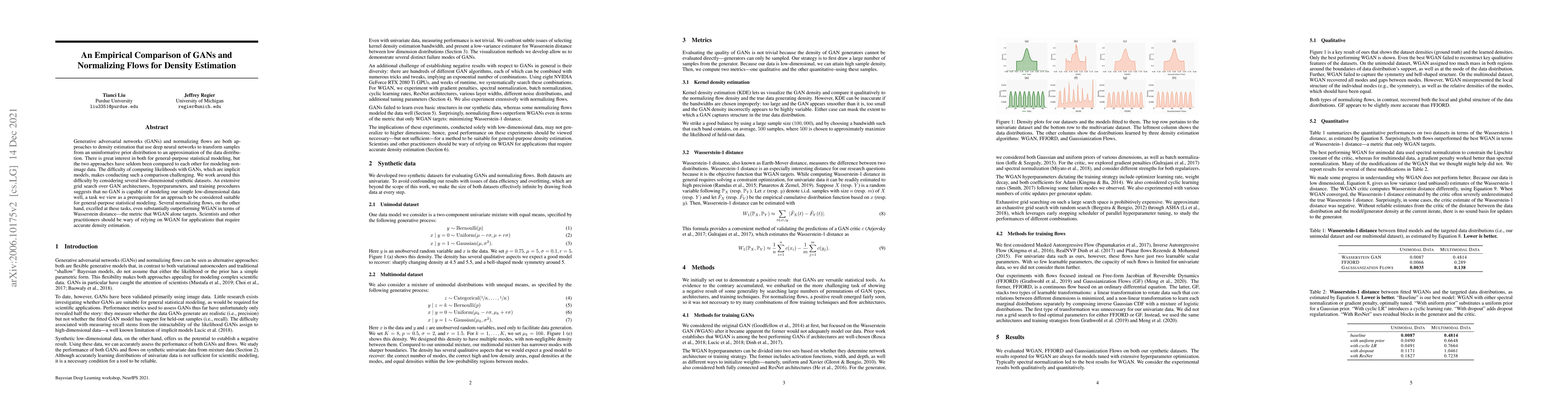 Generative adversarial networks (GANs) and normalizing flows are both approaches to density estimation that use deep neural networks to transform samples from an uninformative prior distribution to an approximation of the data distribution. There is great interest in both for general-purpose statistical modeling, but the two approaches have seldom been compared to each other for modeling non-image data. The difficulty of computing likelihoods with GANs, which are implicit models, makes conducting such a comparison challenging. We work around this difficulty by considering several low-dimensional synthetic datasets. An extensive grid search over GAN architectures, hyperparameters, and training procedures suggests that no GAN is capable of modeling our simple low-dimensional data well, a task we view as a prerequisite for an approach to be considered suitable for general-purpose statistical modeling. Several normalizing flows, on the other hand, excelled at these tasks, even substantially outperforming WGAN in terms of Wasserstein distance -- the metric that WGAN alone targets. Scientists and other practitioners should be wary of relying on WGAN for applications that require accurate density estimation.