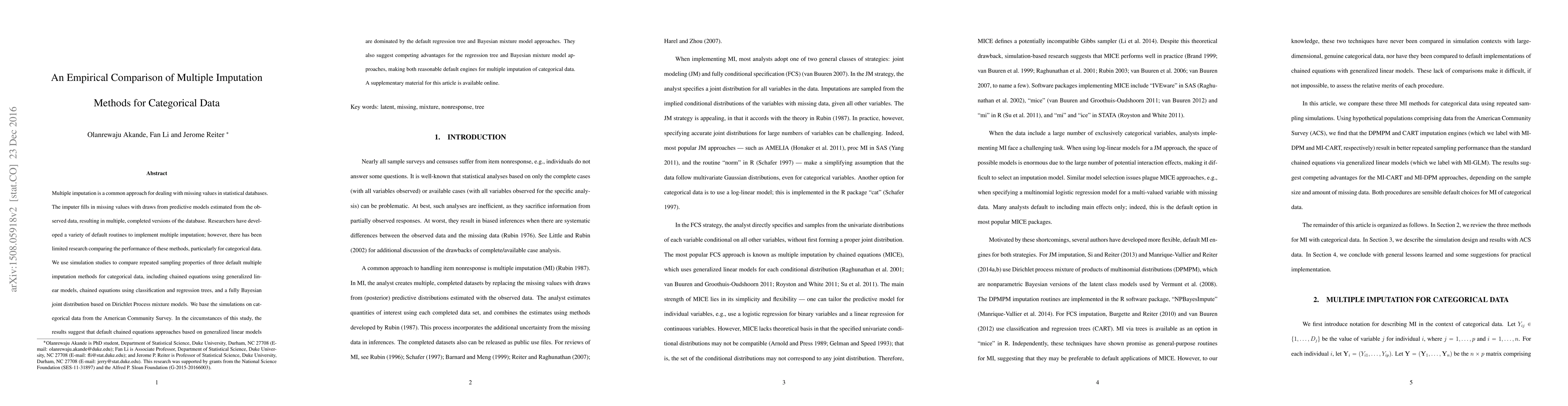 This paper compares the performance of three multiple imputation methods for categorical data through simulation studies, finding that chained equations using classification and regression trees and a fully Bayesian joint distribution based on Dirichlet Process mixture models outperform generalized linear models. The study suggests these latter two methods as preferable default options for handling missing categorical data.