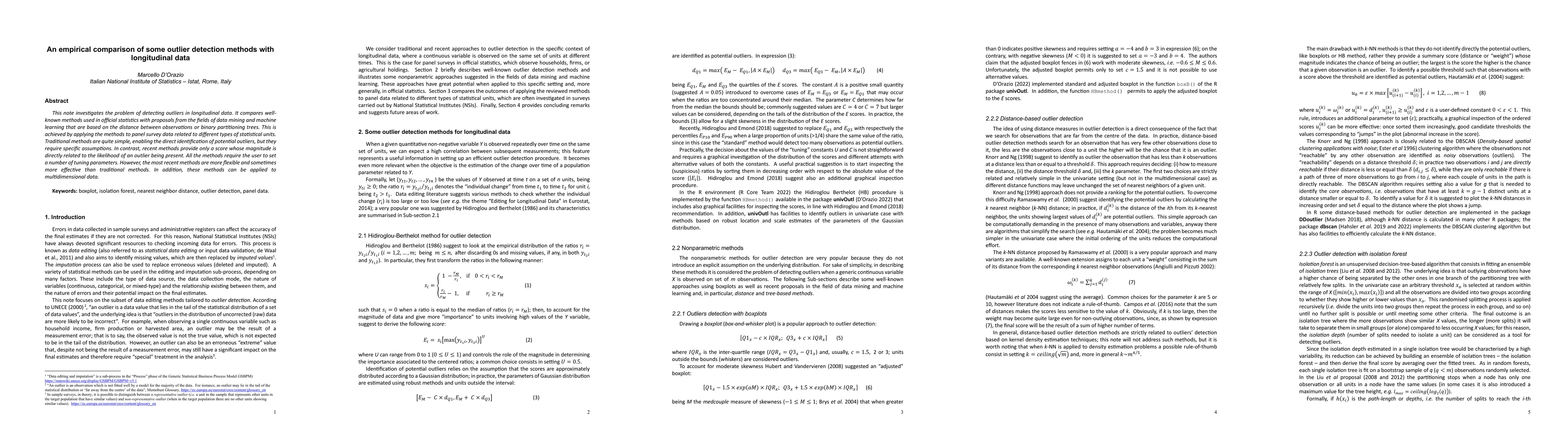This note investigates the problem of detecting outliers in longitudinal data. It compares well-known methods used in official statistics with proposals from the fields of data mining and machine learning that are based on the distance between observations or binary partitioning trees. This is achieved by applying the methods to panel survey data related to different types of statistical units. Traditional methods are quite simple, enabling the direct identification of potential outliers, but they require specific assumptions. In contrast, recent methods provide only a score whose magnitude is directly related to the likelihood of an outlier being present. All the methods require the user to set a number of tuning parameters. However, the most recent methods are more flexible and sometimes more effective than traditional methods. In addition, these methods can be applied to multidimensional data.