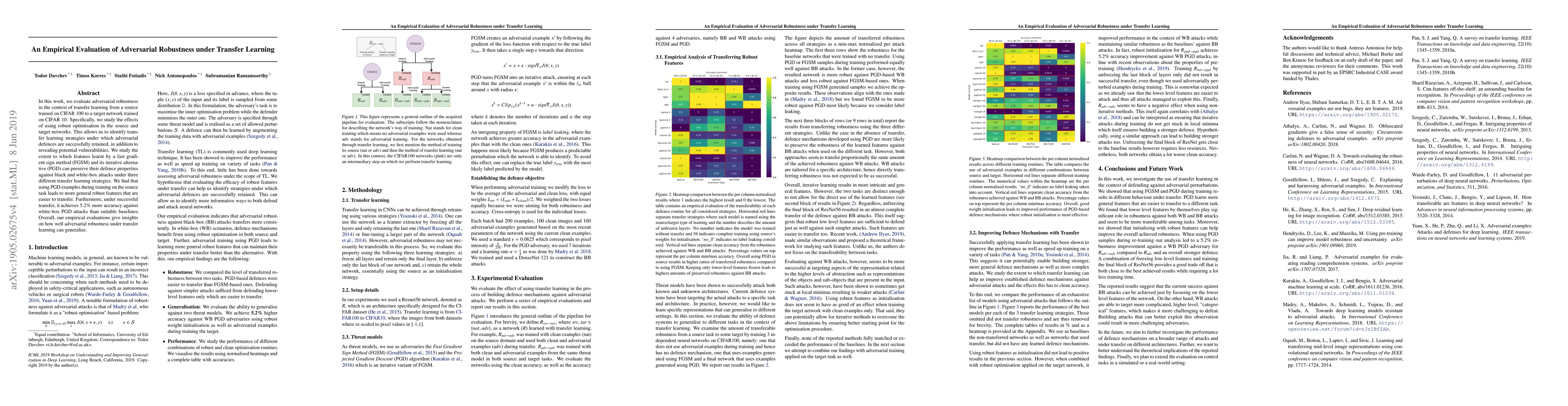 This paper evaluates the transferability of adversarial robustness in transfer learning from CIFAR 100 to CIFAR 10, finding that using PGD examples during training enhances robust feature transfer and improves defence against white-box PGD attacks by 5.2% compared to baselines.