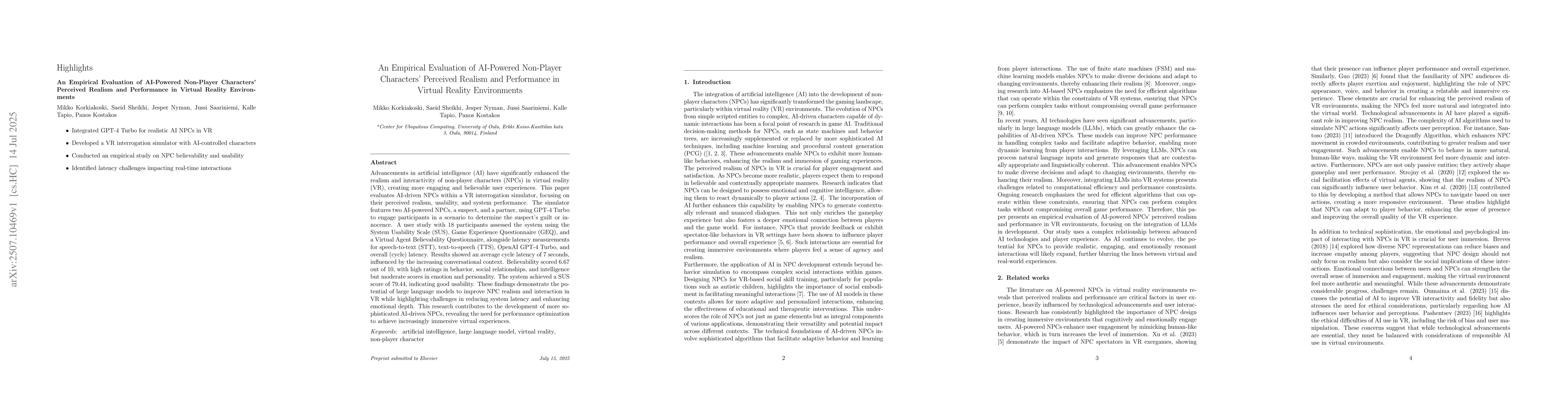 Advancements in artificial intelligence (AI) have significantly enhanced the realism and interactivity of non-player characters (NPCs) in virtual reality (VR), creating more engaging and believable user experiences. This paper evaluates AI-driven NPCs within a VR interrogation simulator, focusing on their perceived realism, usability, and system performance. The simulator features two AI-powered NPCs, a suspect, and a partner, using GPT-4 Turbo to engage participants in a scenario to determine the suspect's guilt or innocence. A user study with 18 participants assessed the system using the System Usability Scale (SUS), Game Experience Questionnaire (GEQ), and a Virtual Agent Believability Questionnaire, alongside latency measurements for speech-to-text (STT), text-to-speech (TTS), OpenAI GPT-4 Turbo, and overall (cycle) latency. Results showed an average cycle latency of 7 seconds, influenced by the increasing conversational context. Believability scored 6.67 out of 10, with high ratings in behavior, social relationships, and intelligence but moderate scores in emotion and personality. The system achieved a SUS score of 79.44, indicating good usability. These findings demonstrate the potential of large language models to improve NPC realism and interaction in VR while highlighting challenges in reducing system latency and enhancing emotional depth. This research contributes to the development of more sophisticated AI-driven NPCs, revealing the need for performance optimization to achieve increasingly immersive virtual experiences.