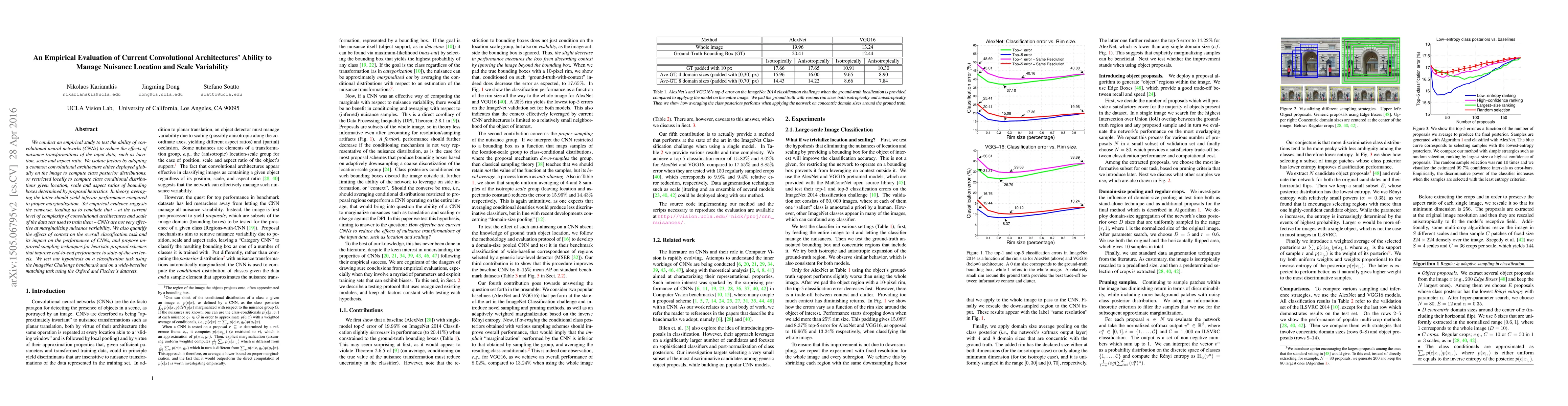 We conduct an empirical study to test the ability of Convolutional Neural Networks (CNNs) to reduce the effects of nuisance transformations of the input data, such as location, scale and aspect ratio. We isolate factors by adopting a common convolutional architecture either deployed globally on the image to compute class posterior distributions, or restricted locally to compute class conditional distributions given location, scale and aspect ratios of bounding boxes determined by proposal heuristics. In theory, averaging the latter should yield inferior performance compared to proper marginalization. Yet empirical evidence suggests the converse, leading us to conclude that - at the current level of complexity of convolutional architectures and scale of the data sets used to train them - CNNs are not very effective at marginalizing nuisance variability. We also quantify the effects of context on the overall classification task and its impact on the performance of CNNs, and propose improved sampling techniques for heuristic proposal schemes that improve end-to-end performance to state-of-the-art levels. We test our hypothesis on a classification task using the ImageNet Challenge benchmark and on a wide-baseline matching task using the Oxford and Fischer's datasets.