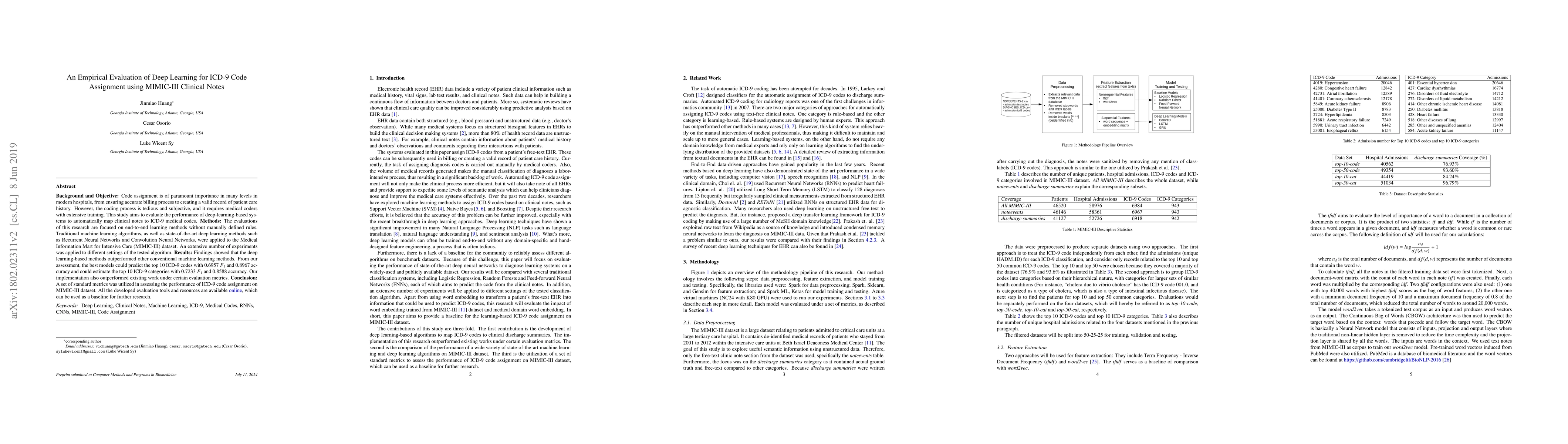 This study evaluates deep learning methods for automatically mapping clinical notes to ICD-9 codes using the MIMIC-III dataset, finding that deep learning models outperform traditional machine learning, achieving notable F1 scores and accuracy rates. The developed tools and resources are made publicly available for future research.
