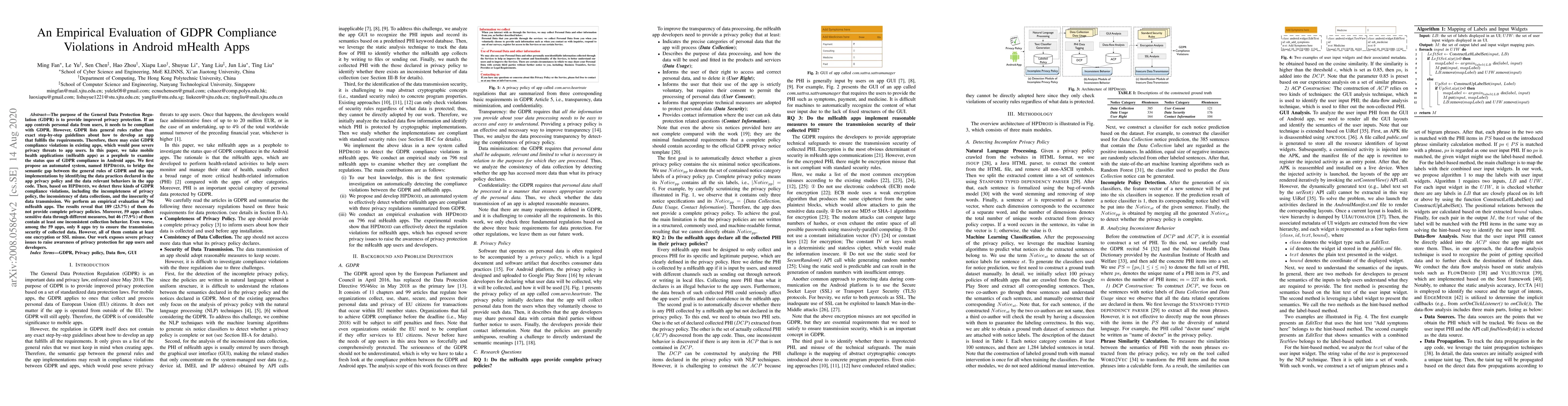 This research uses a combination of natural language processing (NLP) techniques and program analysis to automatically detect compliance violations between the GDPR and mHealth apps.