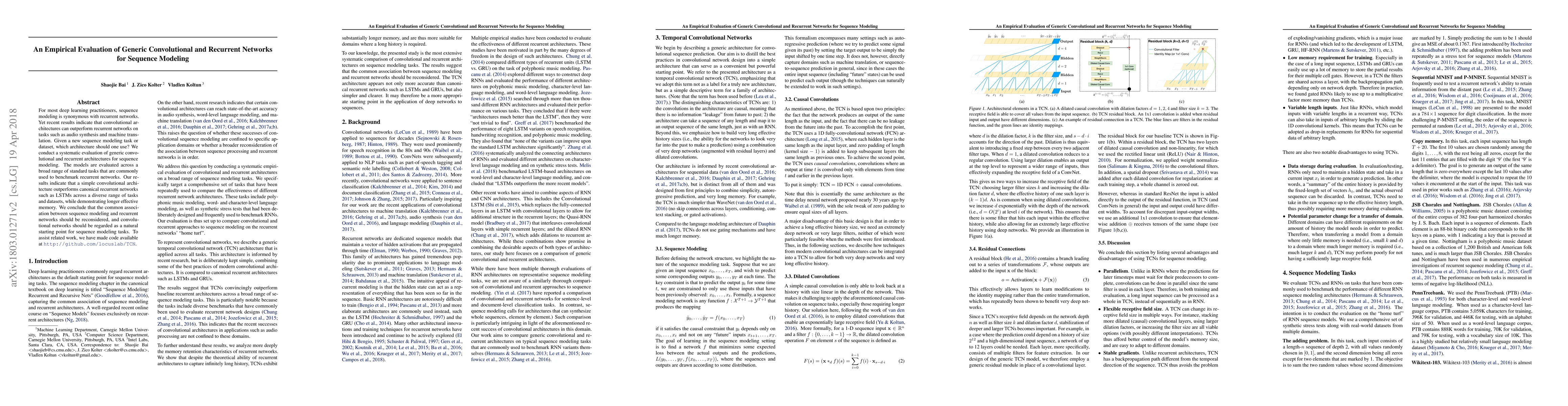 This research compares convolutional and recurrent networks for sequence modeling, finding that simple convolutional architectures outperform recurrent networks like LSTMs across various tasks, suggesting a reconsideration of the default sequence modeling approach. The study recommends convolutional networks as a primary option for new sequence modeling tasks.
