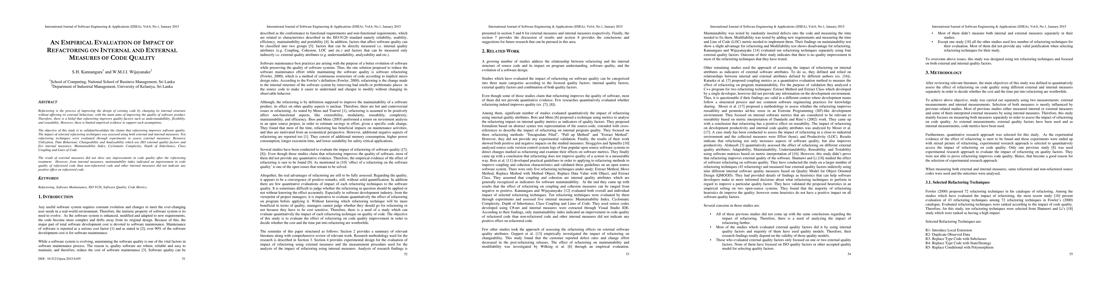 This study empirically evaluates the impact of refactoring on both internal and external measures of code quality, finding no improvement in external measures but an increase in the maintainability index among internal measures. The study concludes that while refactoring may enhance internal quality factors, it does not necessarily improve external quality factors like resource utilization and time behavior.