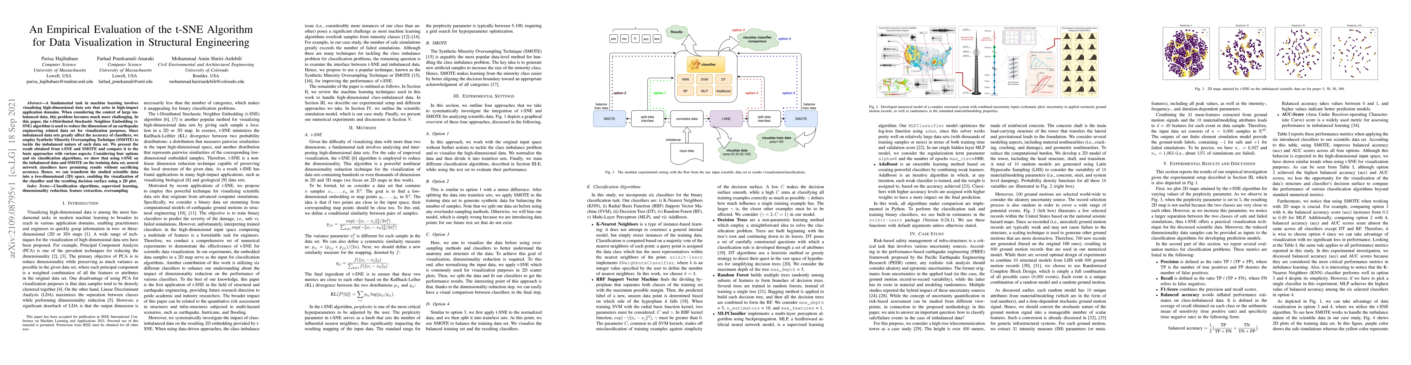 This paper evaluates the t-SNE algorithm for visualizing high-dimensional earthquake engineering data, addressing the challenge of data imbalance with SMOTE. The study demonstrates that t-SNE combined with SMOTE and neural network classifiers effectively reduces dimensions while maintaining accuracy, facilitating 2D visualization.