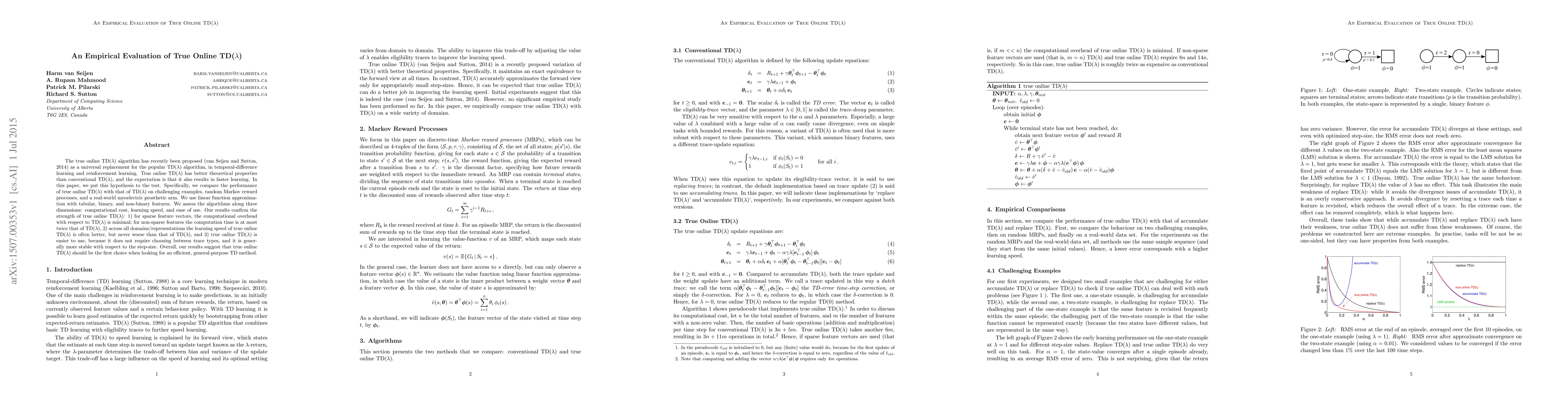 This paper empirically evaluates the true online TD({\lambda}) algorithm against the conventional TD({\lambda}) algorithm, finding that it has minimal computational overhead for sparse features, faster learning speed, and is easier to use, making it a superior general-purpose temporal-difference learning method.