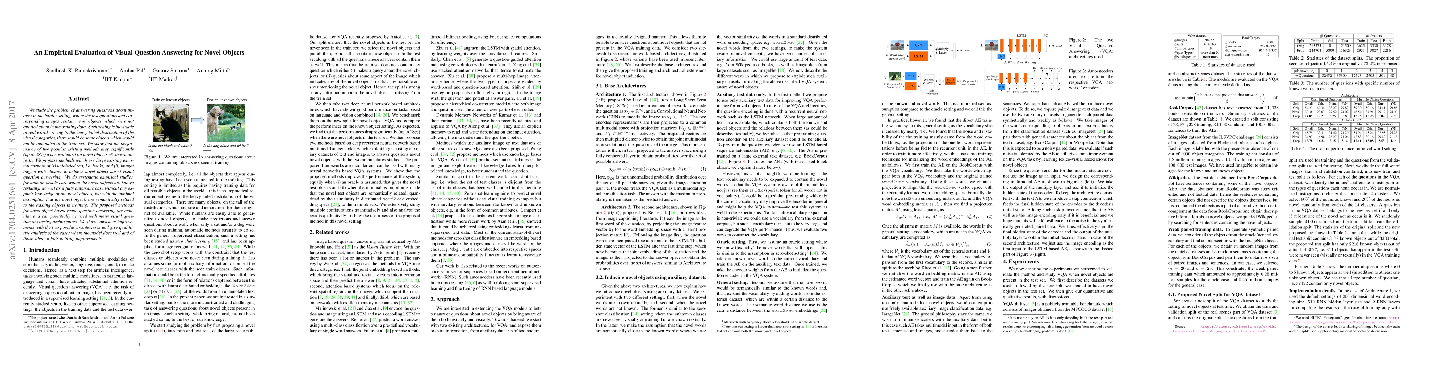 This paper investigates the challenge of answering questions about images containing novel objects not seen during training. It demonstrates significant performance drops in existing methods and proposes solutions leveraging external corpora to improve novel object-based visual question answering, showing consistent improvements across different architectures.