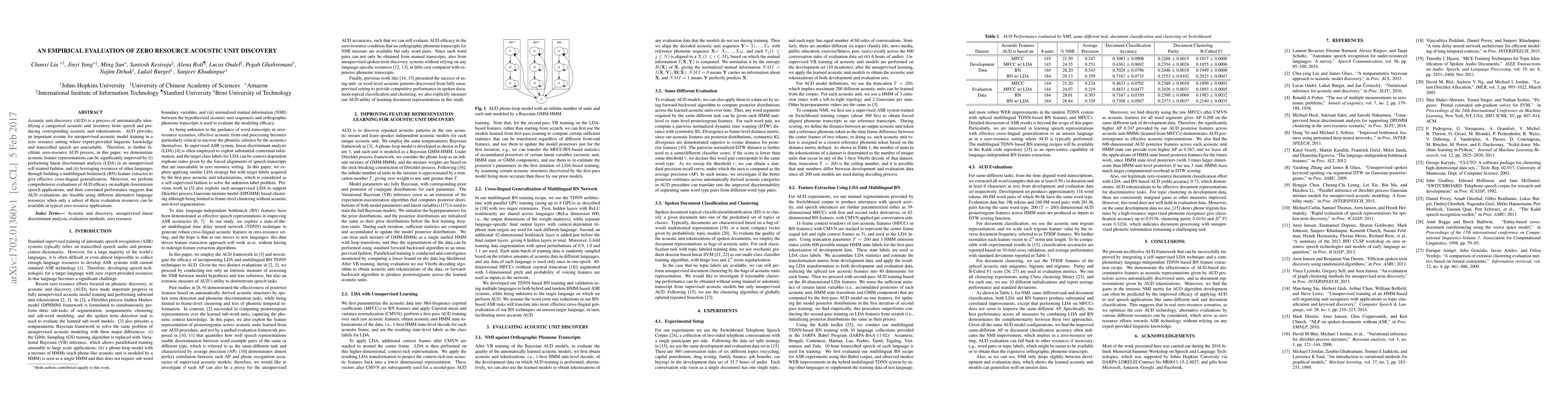 This paper evaluates zero-resource acoustic unit discovery (AUD) by improving acoustic feature representations through unsupervised linear discriminant analysis and multilingual bottleneck feature extractors. The study demonstrates AUD's effectiveness across various speech applications, showing that alternative language resources can substitute when full evaluation resources are unavailable.