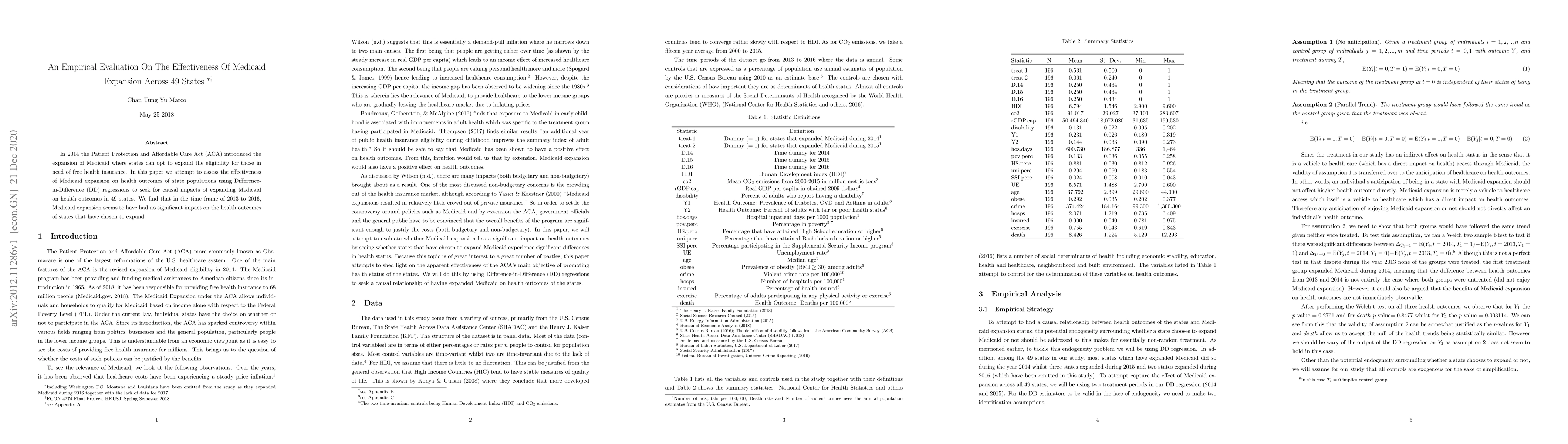 In 2014 the Patient Protection and Affordable Care Act (ACA) introduced the expansion of Medicaid where states can opt to expand the eligibility for those in need of free health insurance. In this paper, we attempt to assess the effectiveness of Medicaid expansion on health outcomes of state populations using Difference-in-Difference (DD) regressions to seek for causal impacts of expanding Medicaid on health outcomes in 49 states. We find that in the time frame of 2013 to 2016, Medicaid expansion seems to have had no significant impact on the health outcomes of states that have chosen to expand.
