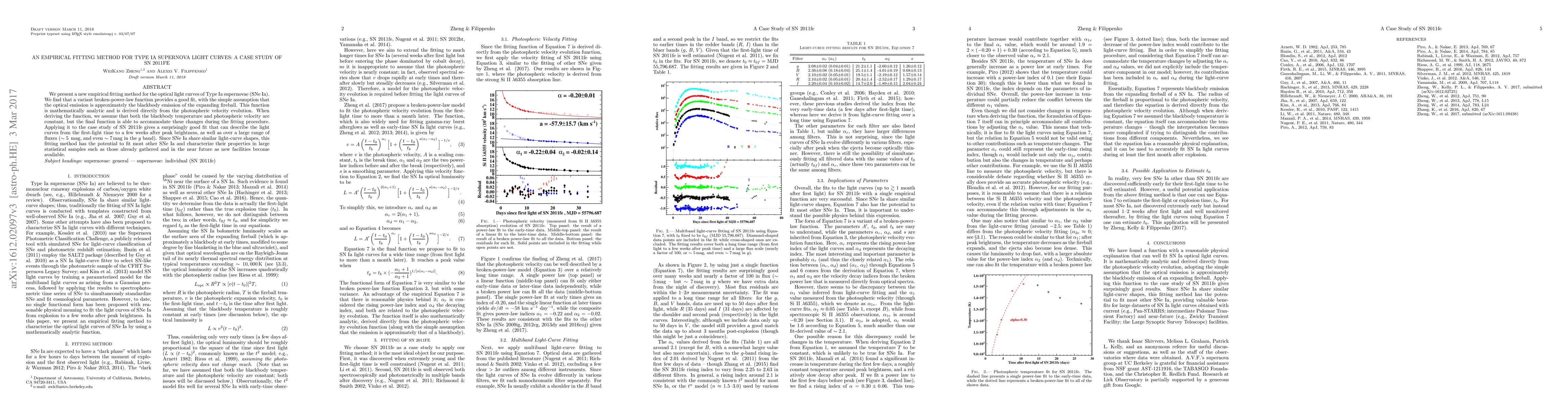 We present a new empirical fitting method for the optical light curves of Type Ia supernovae (SNe~Ia). We find that a variant broken-power-law function provides a good fit, with the simple assumption that the optical emission is approximately the blackbody emission of the expanding fireball. This function is mathematically analytic and is derived directly from the photospheric velocity evolution. When deriving the function, we assume that both the blackbody temperature and photospheric velocity are constant, but the final function is able to accommodate these changes during the fitting procedure. Applying it to the case study of SN~2011fe gives a surprisingly good fit that can describe the light curves from the first-light time to a few weeks after peak brightness, as well as over a large range of fluxes ($\sim 5$\, mag, and even $\sim 7$\,mag in the $g$ band). Since SNe~Ia share similar light-curve shapes, this fitting method has the potential to fit most other SNe~Ia and characterize their properties in large statistical samples such as those already gathered and in the near future as new facilities become available.