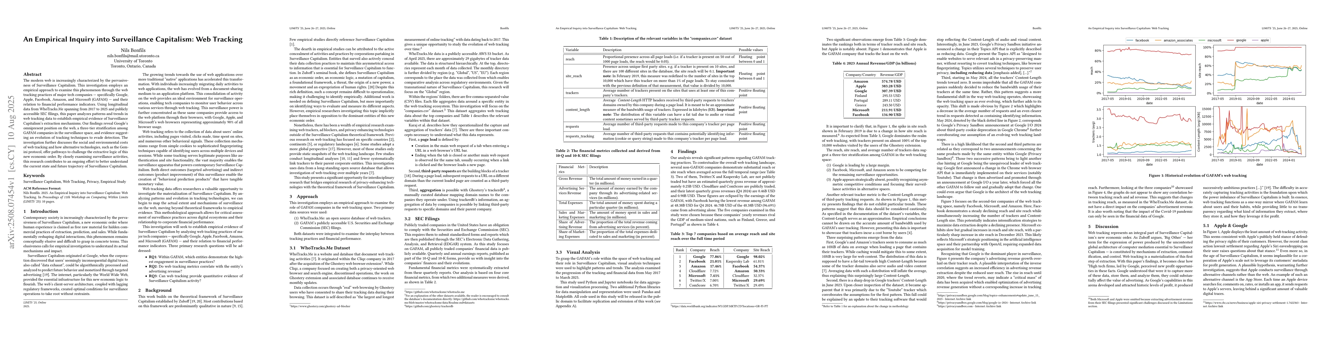 The modern web is increasingly characterized by the pervasiveness of Surveillance Capitalism. This investigation employs an empirical approach to examine this phenomenon through the web tracking practices of major tech companies -- specifically Google, Apple, Facebook, Amazon, and Microsoft (GAFAM) -- and their relation to financial performance indicators. Using longitudinal data from WhoTracks.Me spanning from 2017 to 2025 and publicly accessible SEC filings, this paper analyzes patterns and trends in web tracking data to establish empirical evidence of Surveillance Capitalism's extraction mechanisms. Our findings reveal Google's omnipresent position on the web, a three-tier stratification among GAFAM companies in the surveillance space, and evidence suggesting an evolution of tracking techniques to evade detection. The investigation further discusses the social and environmental costs of web tracking and how alternative technologies, such as the Gemini protocol, offer pathways to challenge the extractive logic of this new economic order. By closely examining surveillance activities, this research contributes to an ongoing effort to better understand the current state and future trajectory of Surveillance Capitalism.