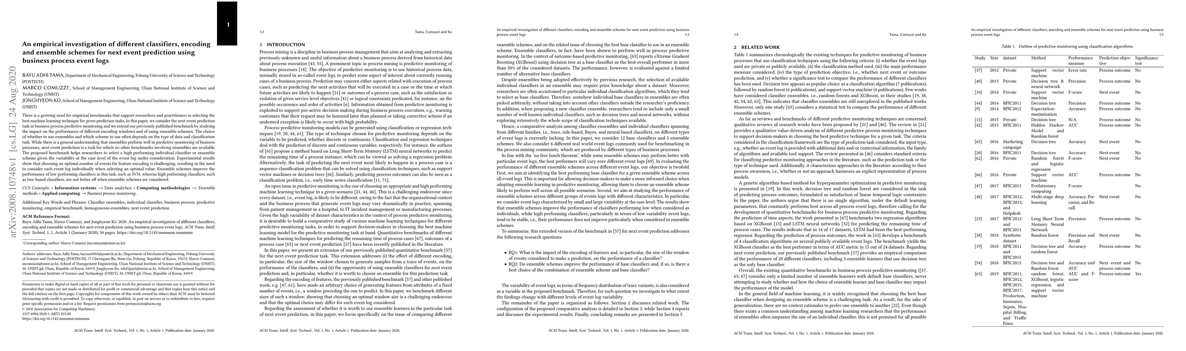 This paper benchmarks various classifiers, encoding windows, and ensemble schemes for next event prediction in business process monitoring, finding that ensemble schemes enhance low-performing classifiers but do not benefit high-performing ones, and optimal feature encoding depends on the specific event log.