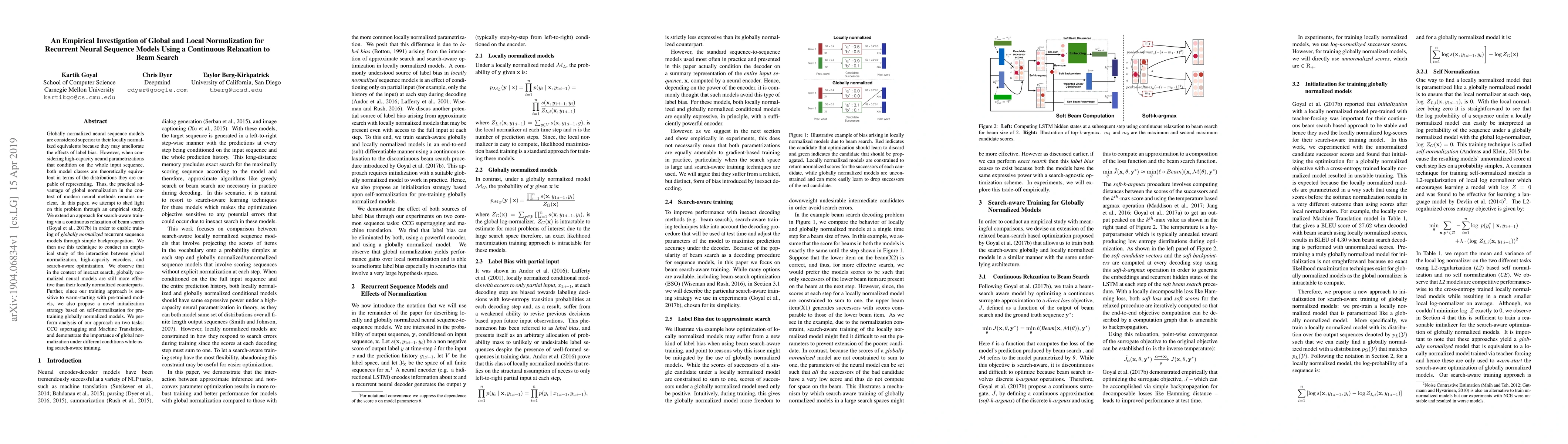 This paper investigates the effectiveness of globally normalized neural sequence models in comparison to their locally normalized counterparts using a novel training approach based on continuous relaxation of beam search. Globally normalized models outperform locally normalized ones in certain conditions, particularly with high-capacity encoders and inexact search.