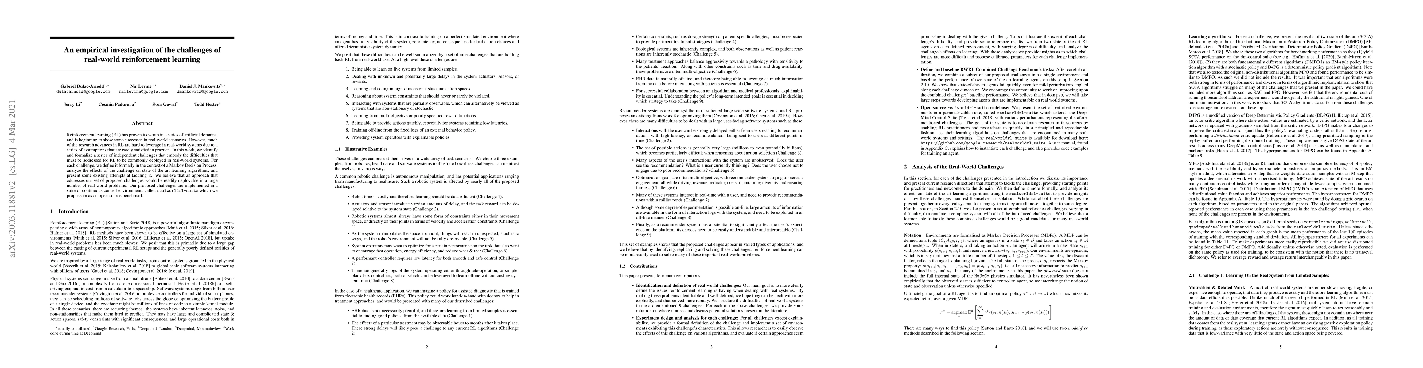 This research paper identifies and formally defines a series of challenges hindering real-world reinforcement learning (RL) deployment. The authors analyze these challenges within Markov Decision Processes, evaluate their impact on current RL algorithms, and present existing solutions. They propose a benchmark suite, realworldrl-suite, to facilitate addressing these challenges for broader real-world application of RL.