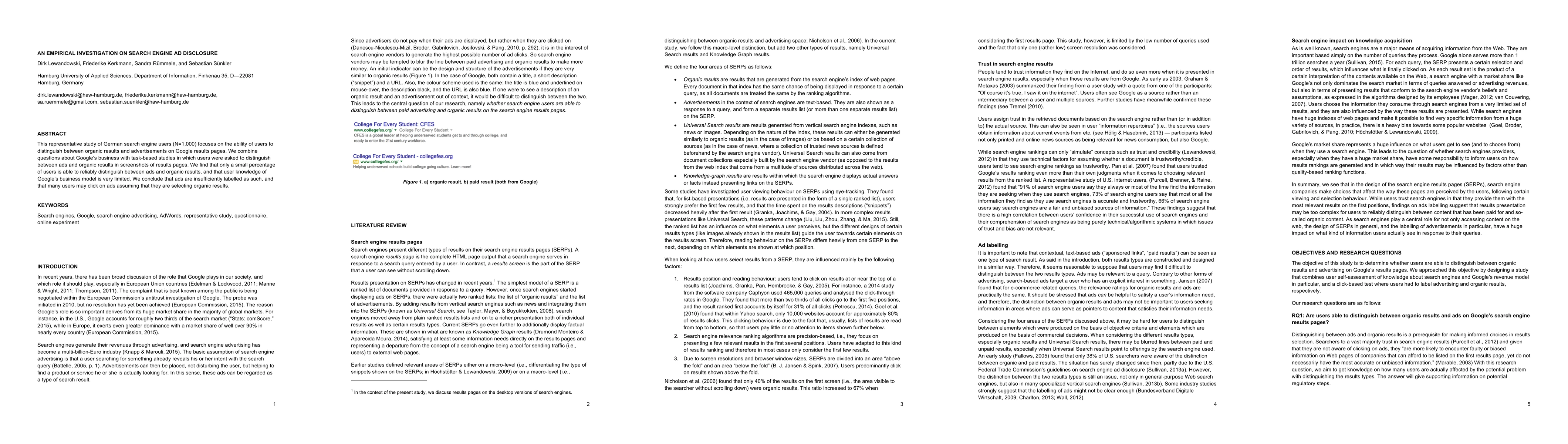 A study of 1,000 German search engine users found that most cannot reliably distinguish between ads and organic results on Google, suggesting inadequate ad labeling.
