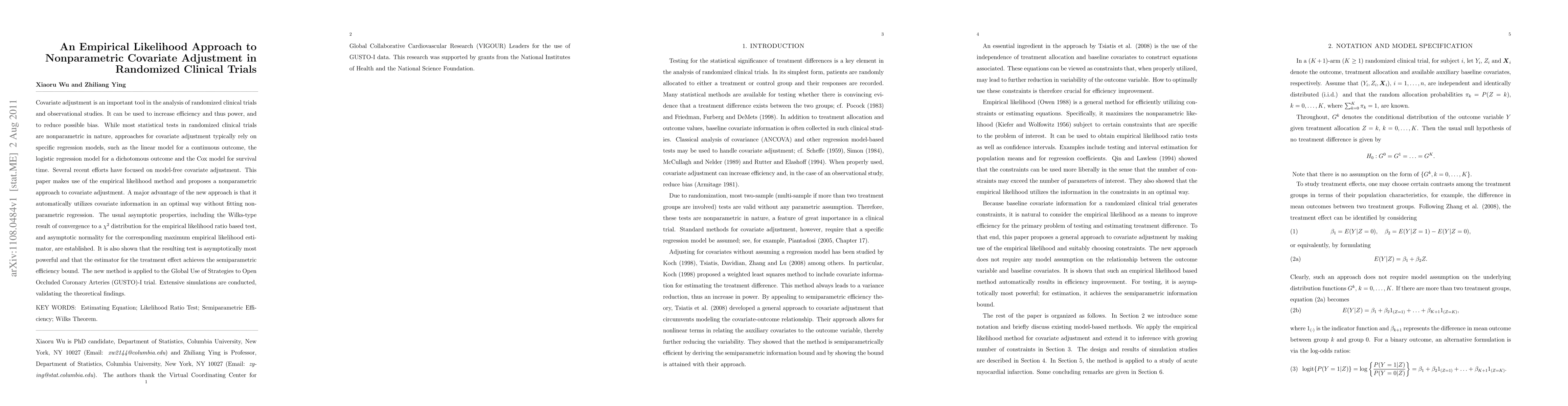 This paper proposes a nonparametric empirical likelihood approach for covariate adjustment in randomized clinical trials, which optimally utilizes covariate information without relying on specific regression models. The method demonstrates asymptotic properties and achieves semiparametric efficiency, validated through simulations on the GUSTO-I trial data.