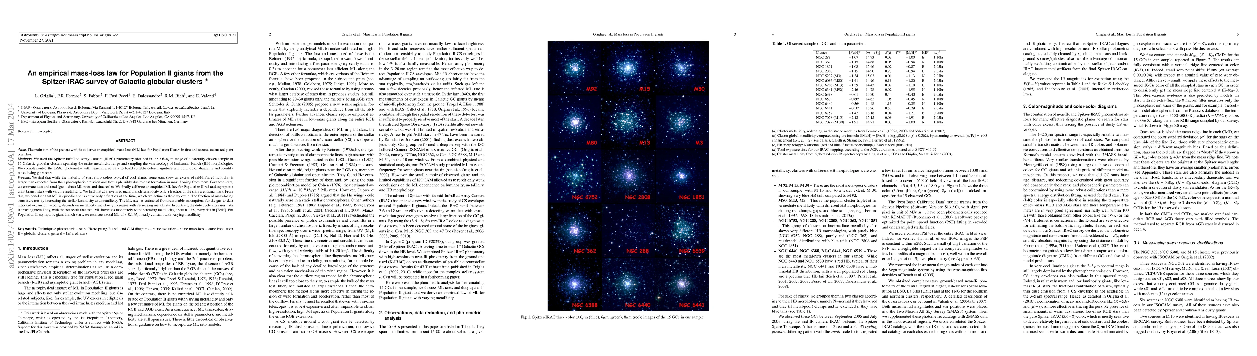 This study derives an empirical mass-loss law for Population II stars in red and asymptotic giant branches using Spitzer-IRAC data from 15 Galactic globular clusters. It finds that mass-loss is episodic, with a fraction of stars losing mass, and that the mass-loss rate increases with decreasing metallicity, while the duty cycle increases with metallicity.