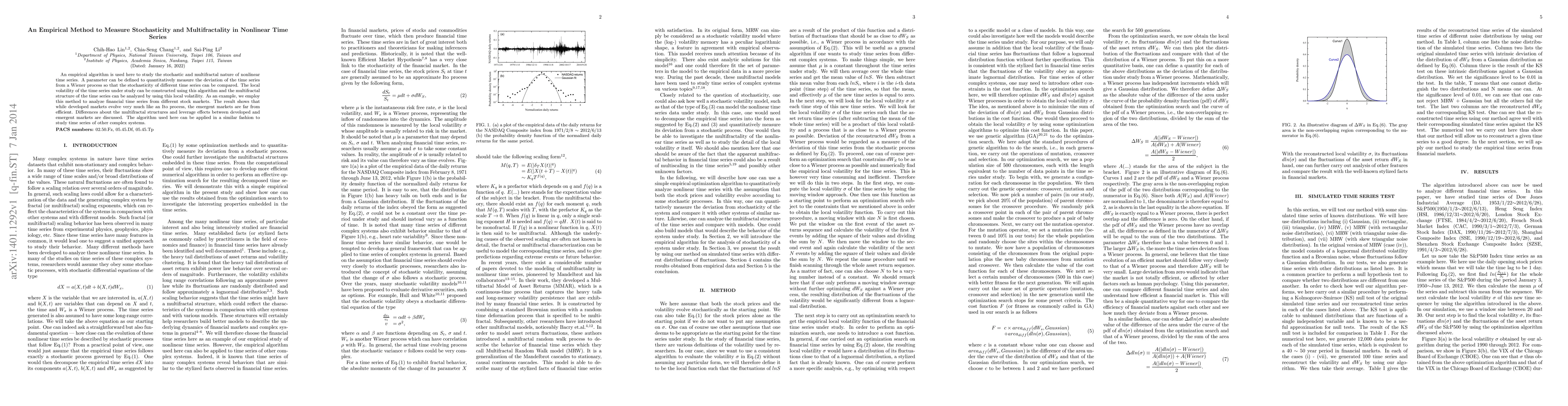 An empirical algorithm is used here to study the stochastic and multifractal nature of nonlinear time series. A parameter can be defined to quantitatively measure the deviation of the time series from a Wiener process so that the stochasticity of different time series can be compared. The local volatility of the time series under study can be constructed using this algorithm and the multifractal structure of the time series can be analyzed by using this local volatility. As an example, we employ this method to analyze financial time series from different stock markets. The result shows that while developed markets evolve very much like an Ito process, the emergent markets are far from efficient. Differences about the multifractal structures and leverage effects between developed and emergent markets are discussed. The algorithm used here can be applied in a similar fashion to study time series of other complex systems.